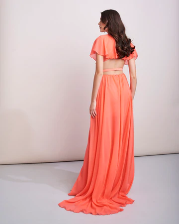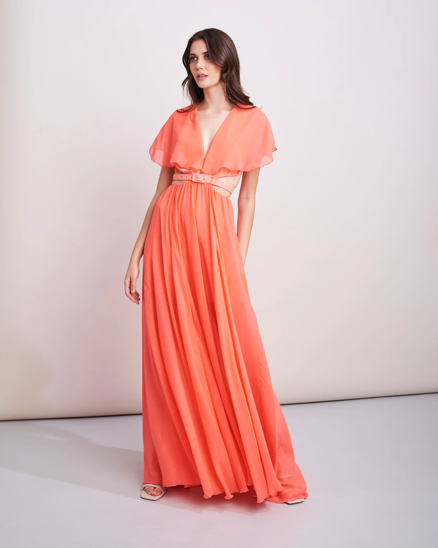 Ricercato abito Feleppa lungo con scollatura geometrica sulla schiena. I giochi di trasparenze creati dal voile accrescono la femminilitร di chi lo indossa. Per completare il look indossare tacchi molto alti. Tonalitร disponibile in Store: Corallo