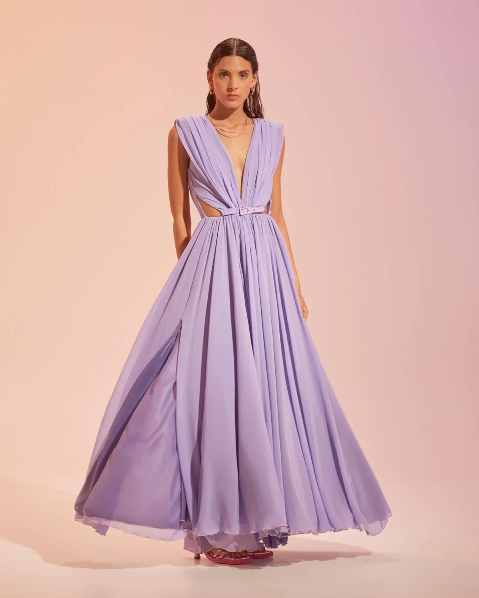 Ricercato abito lungo con scollatura geometrica sulla schiena. I giochi di trasparenze creati dal voile accrescono la femminilità di chi lo indossa. Per completare il look indossare tacchi molto alti.