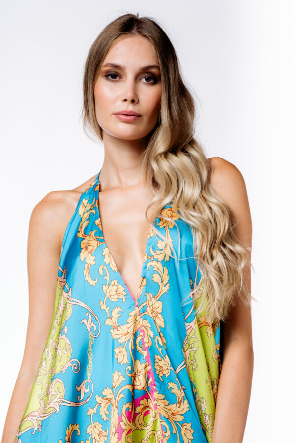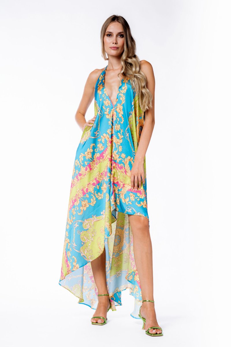Abito lungo No Secrets dalla linea morbida con ampio scollo sul davanti in fantasia foulard. Perfetto per un’occasione speciale in piena estate. Tonalitร disponibile in Store: Foulard/ kiwi