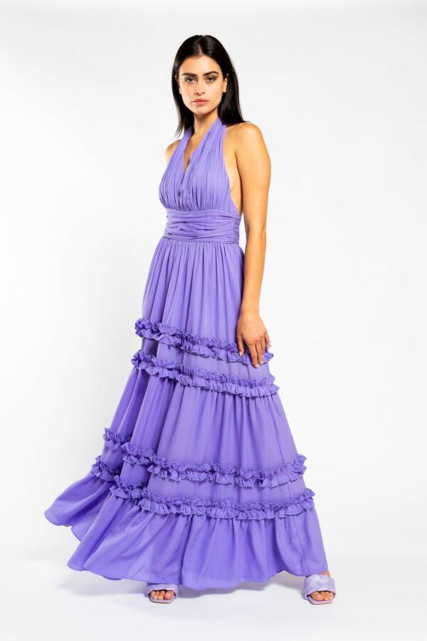 Abito lungo Nosecrets con balze e scollo a V. Tonalitร disponibile in Store: Lilla