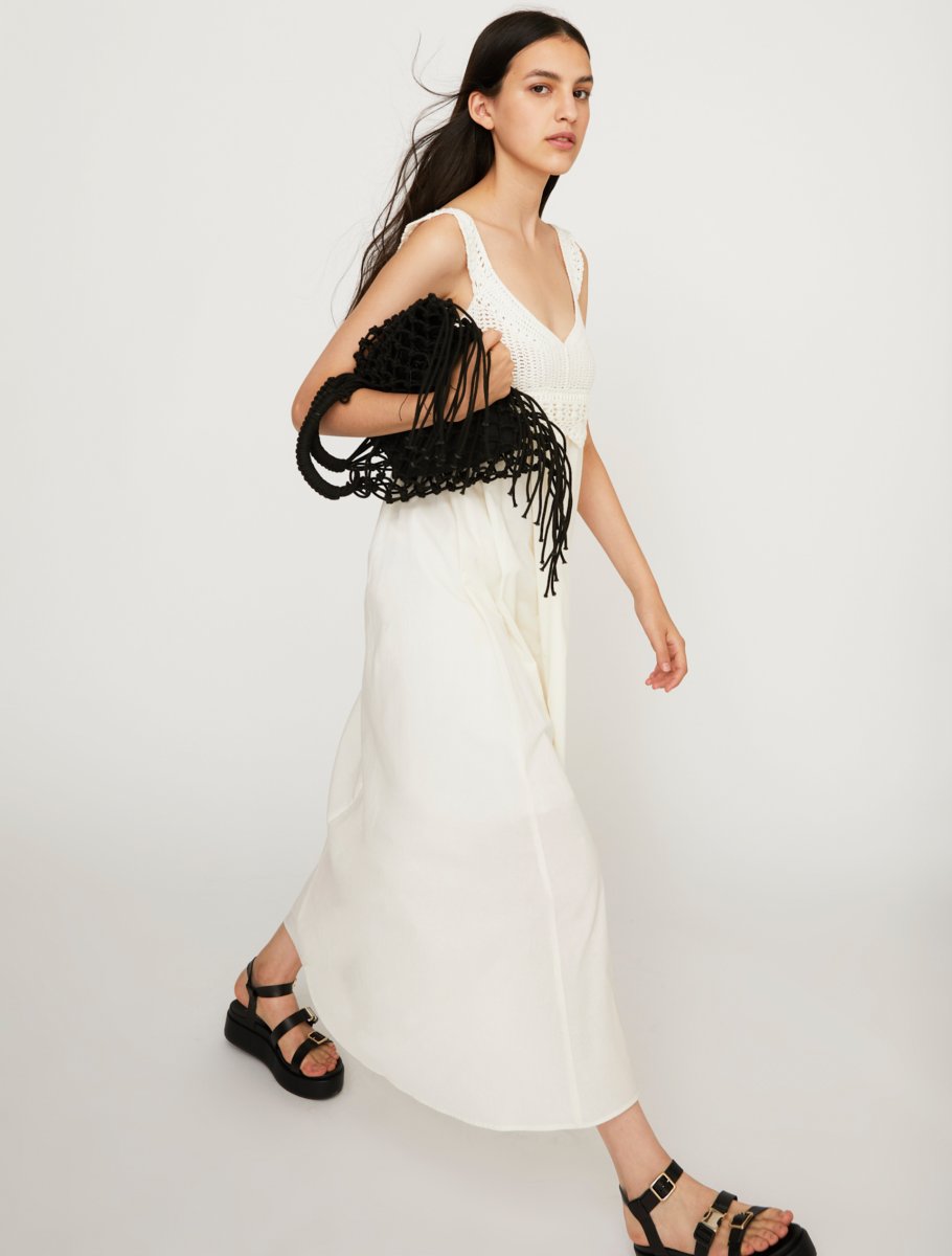 Abito lungo Iblues con top lavorato a mano in macramรฉ misto cotone e gonna morbida e scivolata in cotone. Scollo a V con spalline e bordi smerlati. Foderato e chiuso con zip sul retro. Tonalitร  disponibili in Store: Bianco e Verde