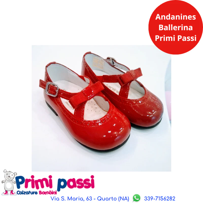 Ballerina Andanines in pelle di Colore Rossa. Chiusura ad incrociatina alla caviglia con fibbietta.Adatta per i primi passi, sottopiede in pelle, fondo in gomma antiscivolo.