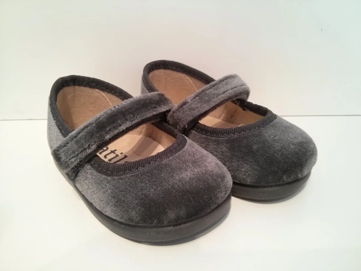 Ballerina in morbidissimo velluto Grigio, sottopiede in pelle con arco plantare in evidenza, e suola in gomma naturale vulcanizzata. Ballerina adatta ai primi passi. Ballerina con cinturino a strappo e con rifiniture super eleganti realizzate in serratex e suola in tinta con il taglio per essere piรน abbinabili. La tua bambina non vorrร toglierli!
