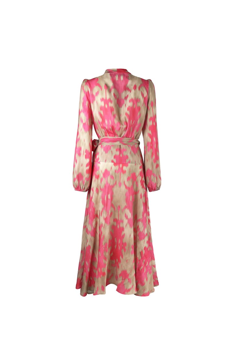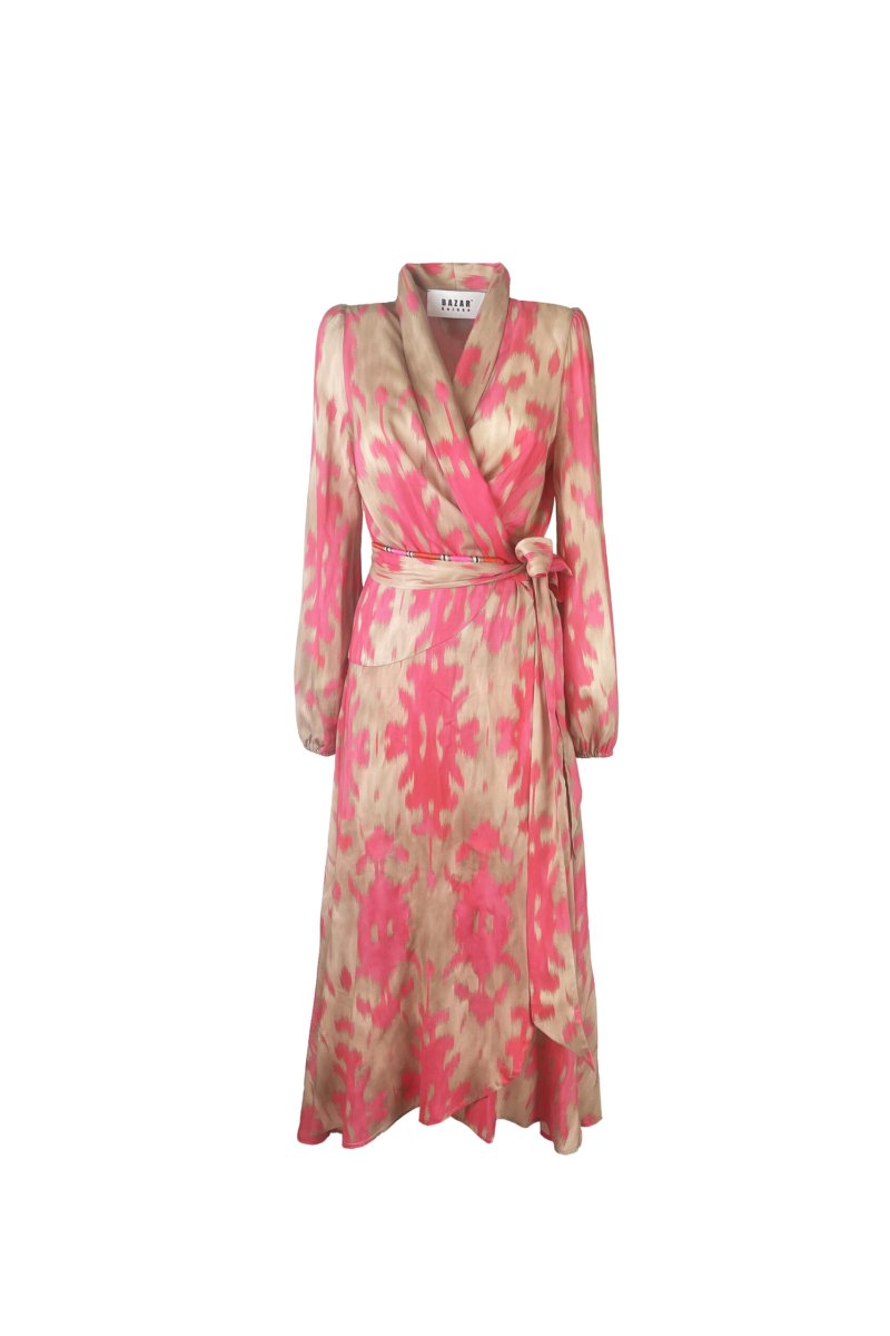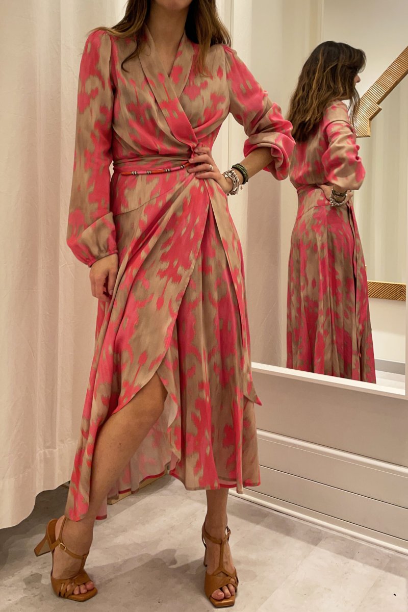 Abito lungo incrociato in fantasia con manica lunga a palloncino