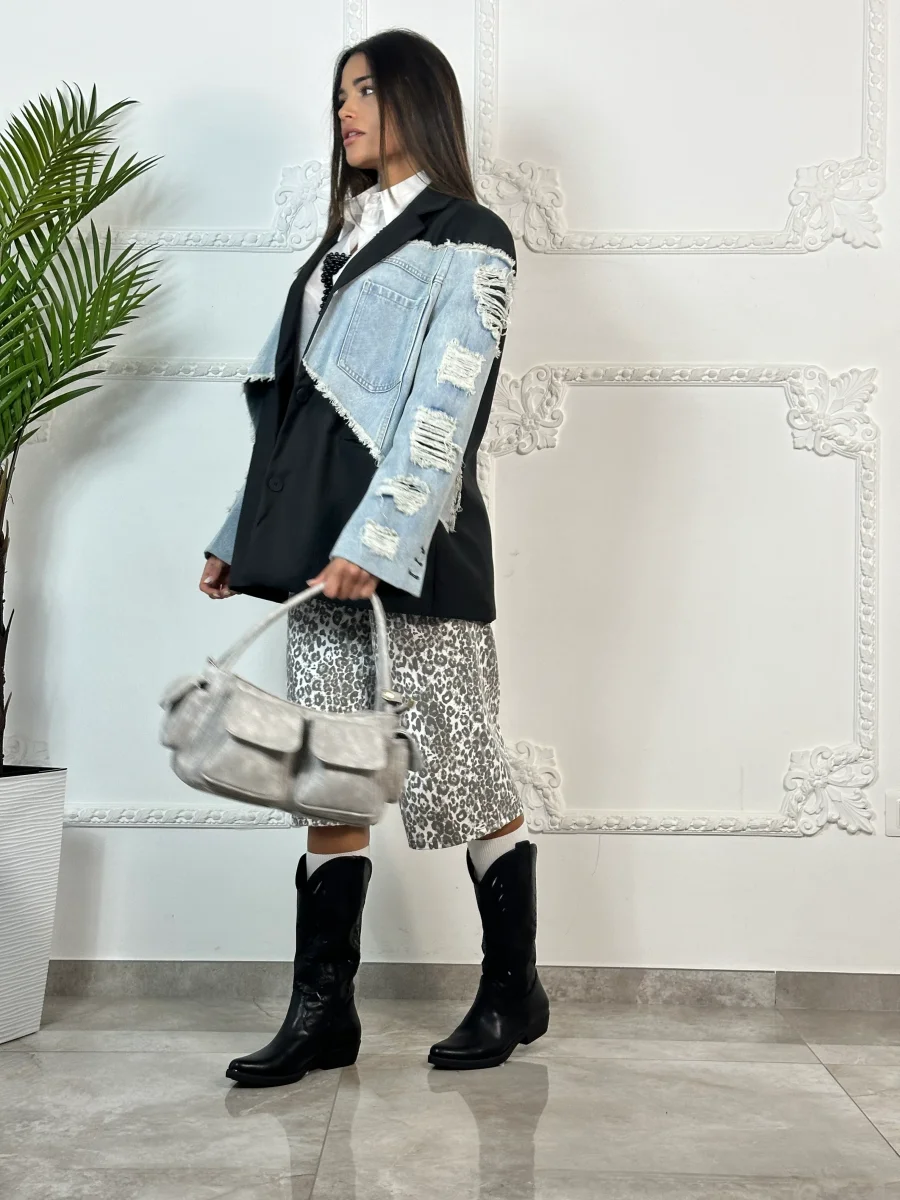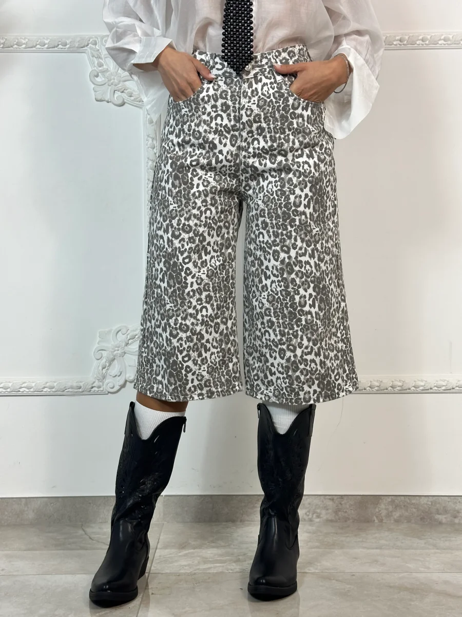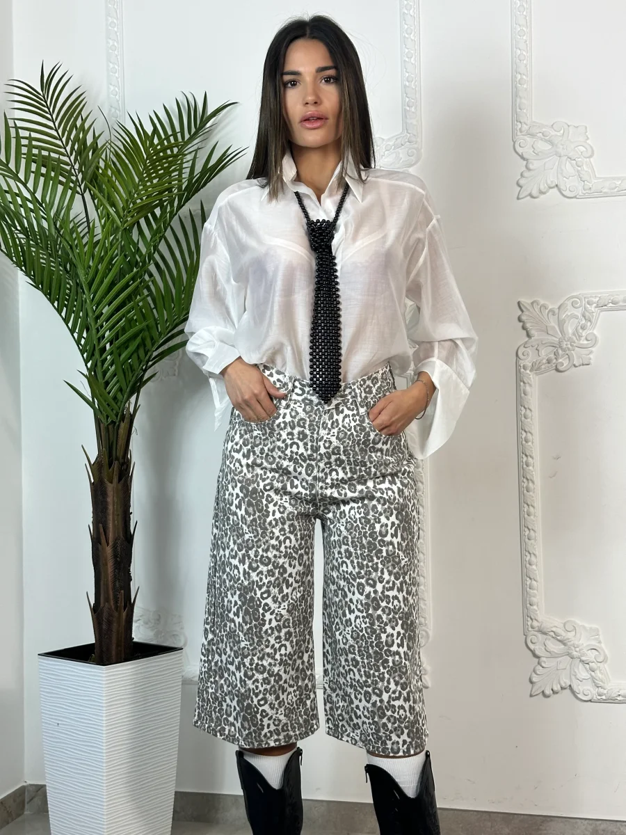 Bermuda in Denim fantasia animalier, vestibilitร non elastica, consigliata da taglia 38 a 44.