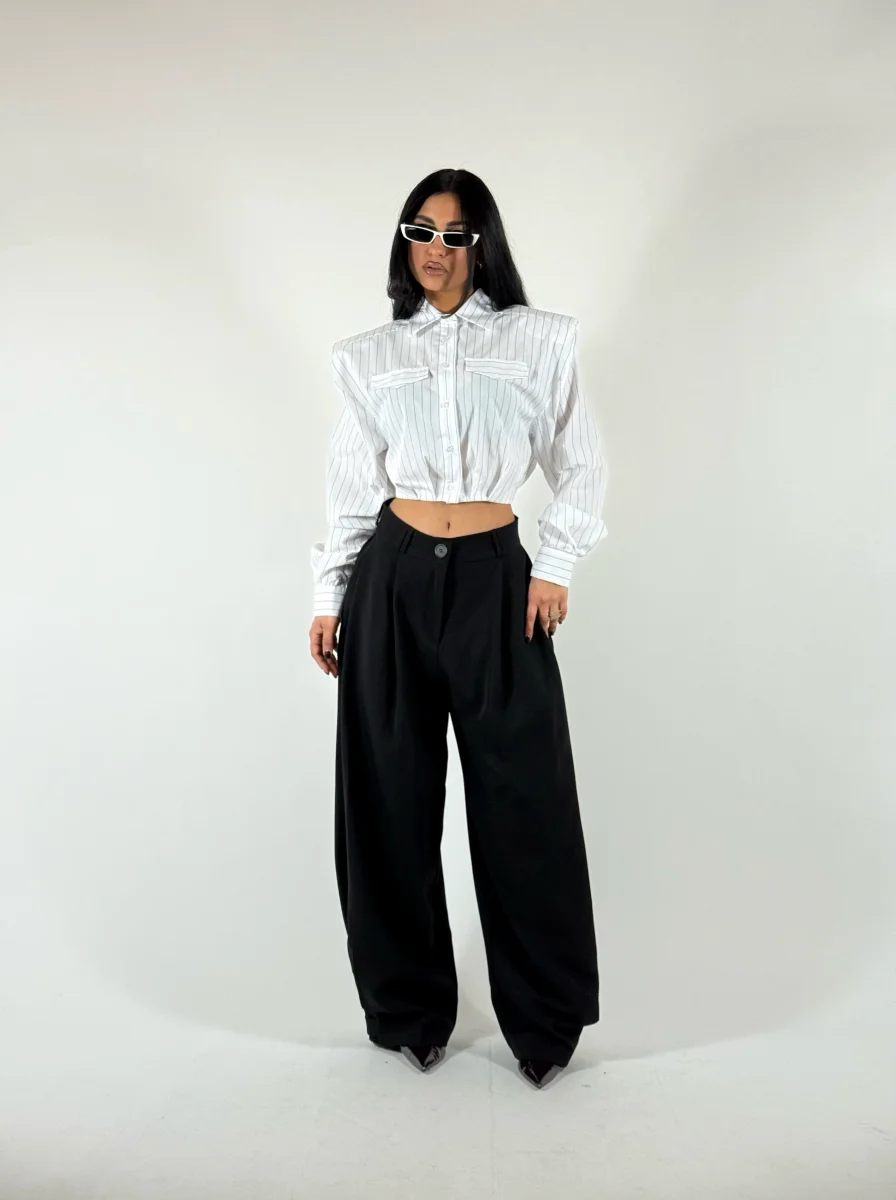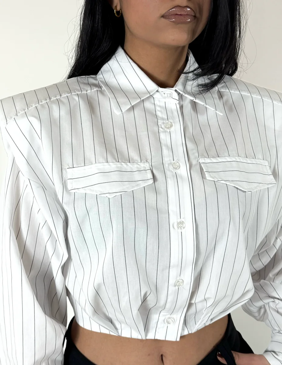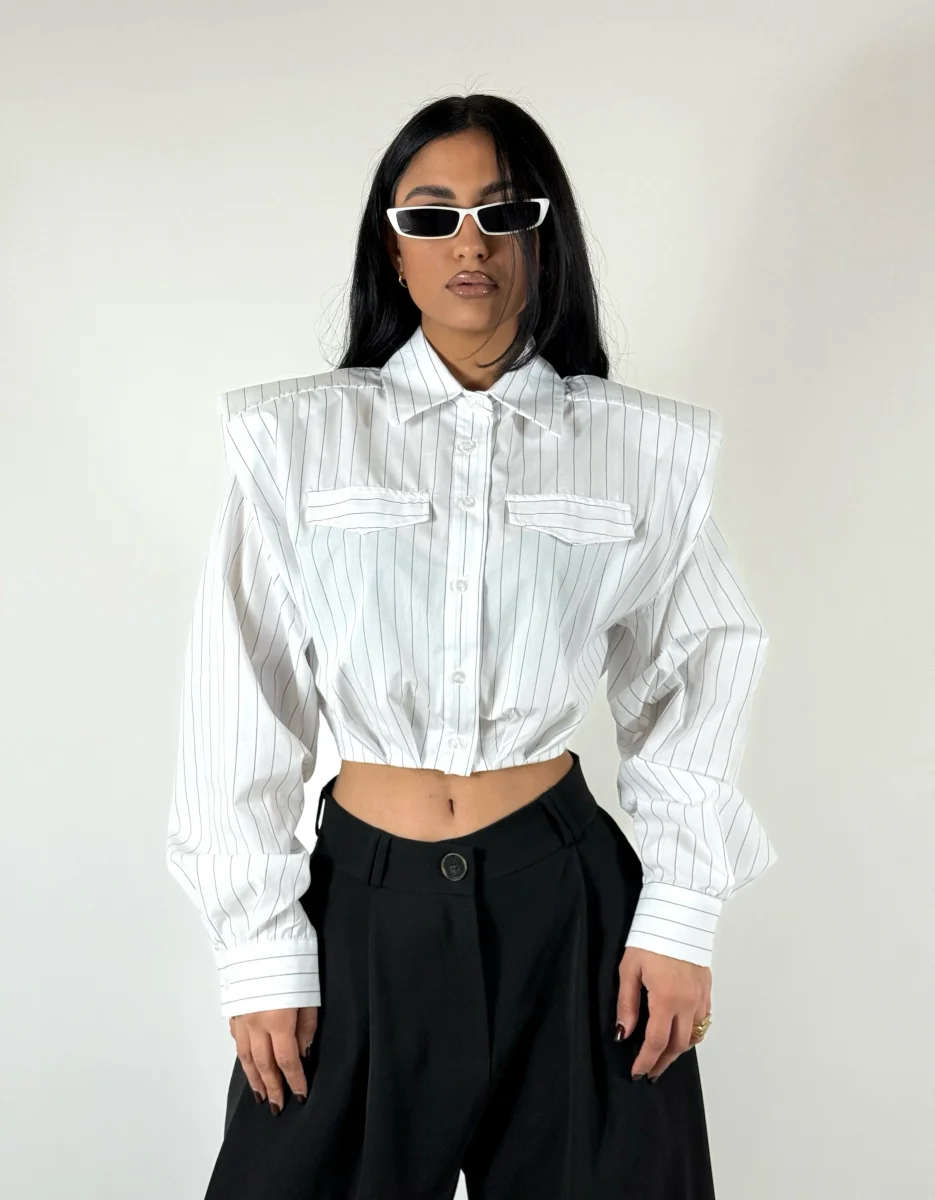 Camicia crop con righe di gesso a contrasto, elastico sul finale, con spalline imbottite, vestibilitร morbida, consigliata fino a taglia 44.