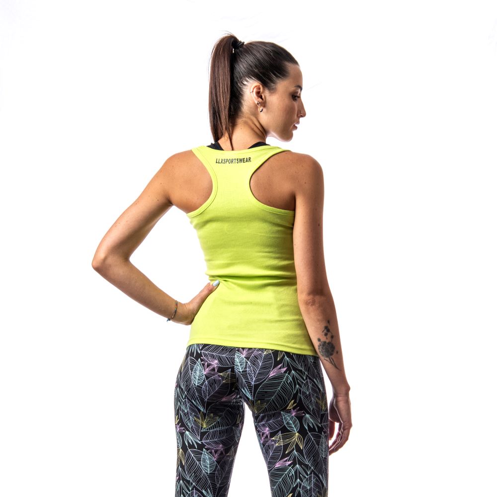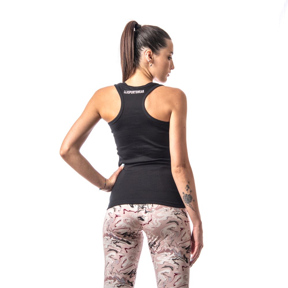 – T-SHIRT DONNA *SEVEN* Descrizione: “Canotta aderente con logo principale sul fronte e nome completo LLXSPORTSWEAR sul retro. Giromanica e scollatura orlata, spalline sul retro stile vogatore. Cuciture laterali. (100% cotone, costina 1×1 , 220 g/mยฒ.