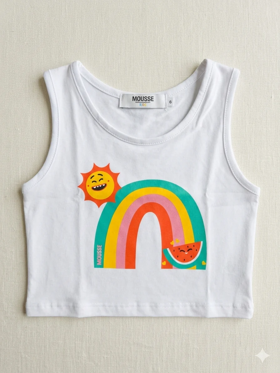 Canottierina bianca con arcobaleno, perfetta per la spiaggia sopra il costume!