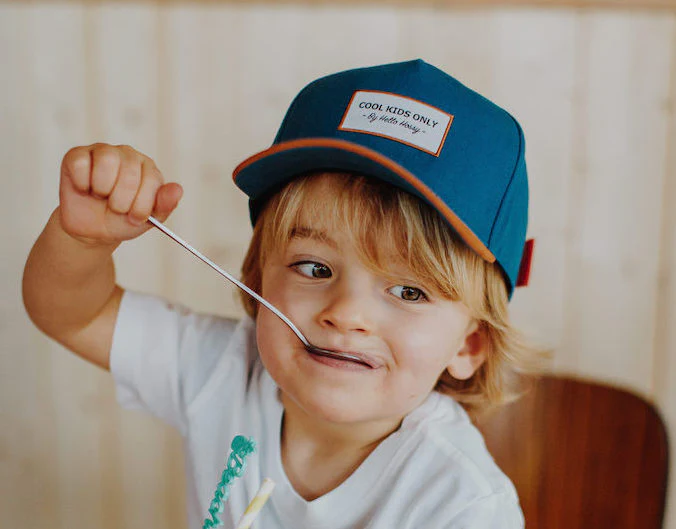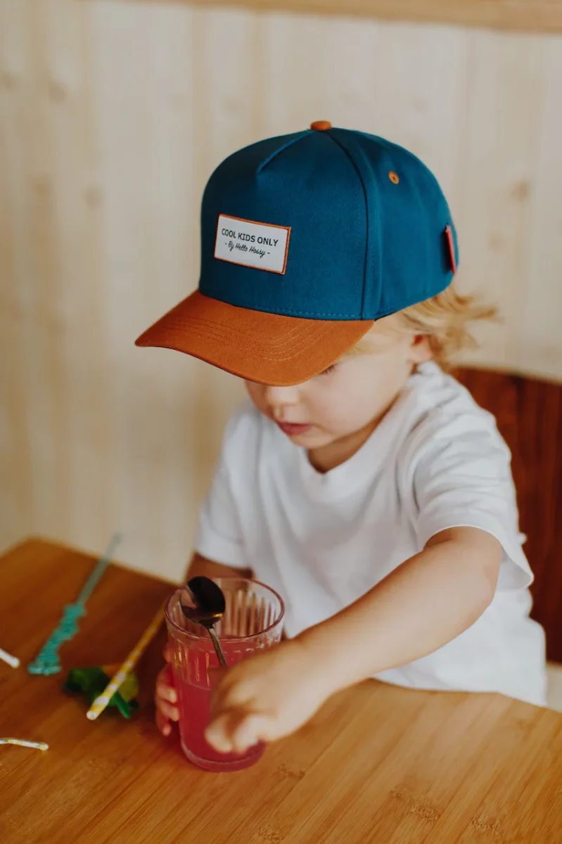 Cappellino unisex in cotone bio Mini Duck Blue, con visiera marrone. Logo COOL KIDS ONLY ricamato davanti. Taglia 6+, dai 52 ai 56cm di circonferenza, cinturino posteriore regolabile. Fai matchy-matchy con papร e regalagli lo stesso cappellino per un look cool!