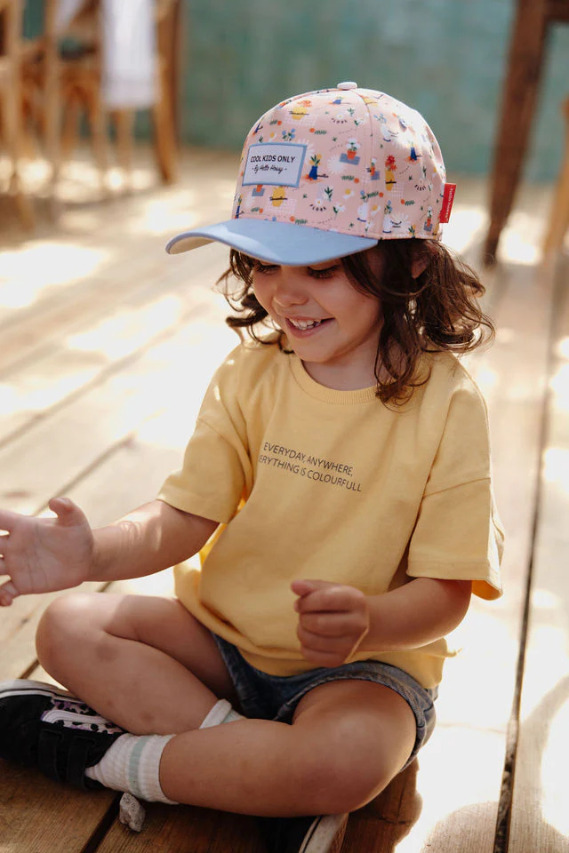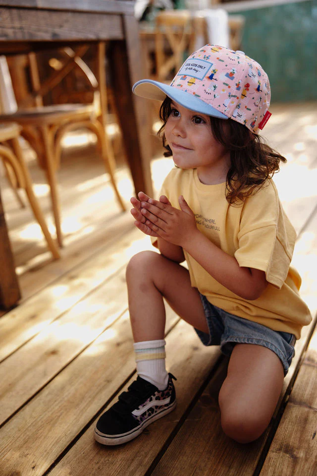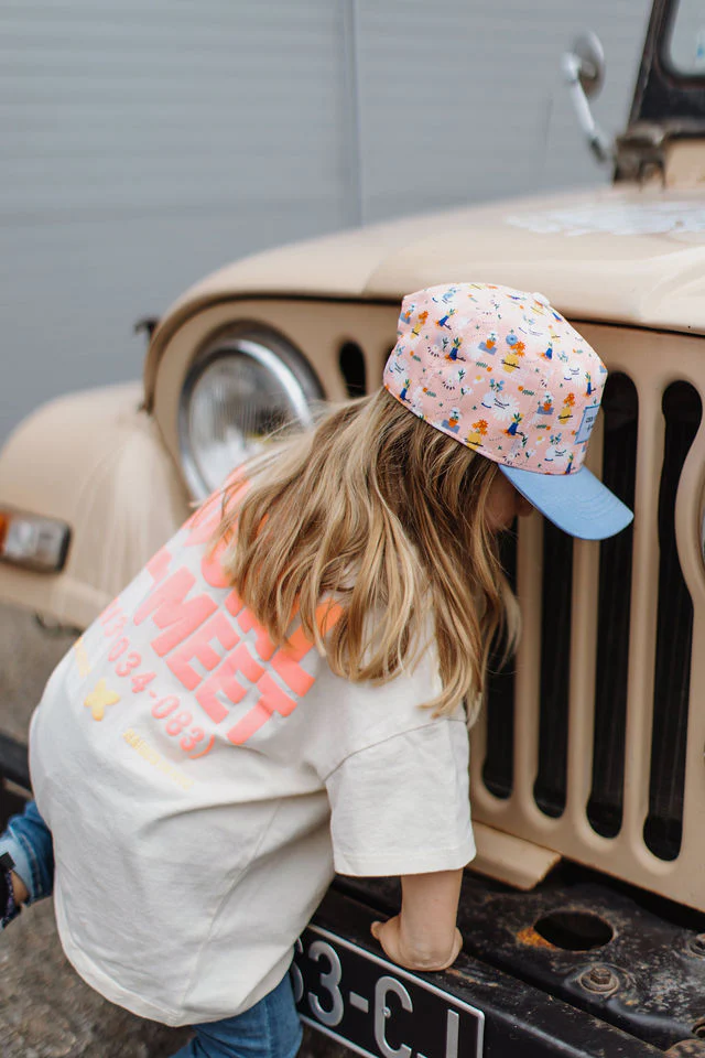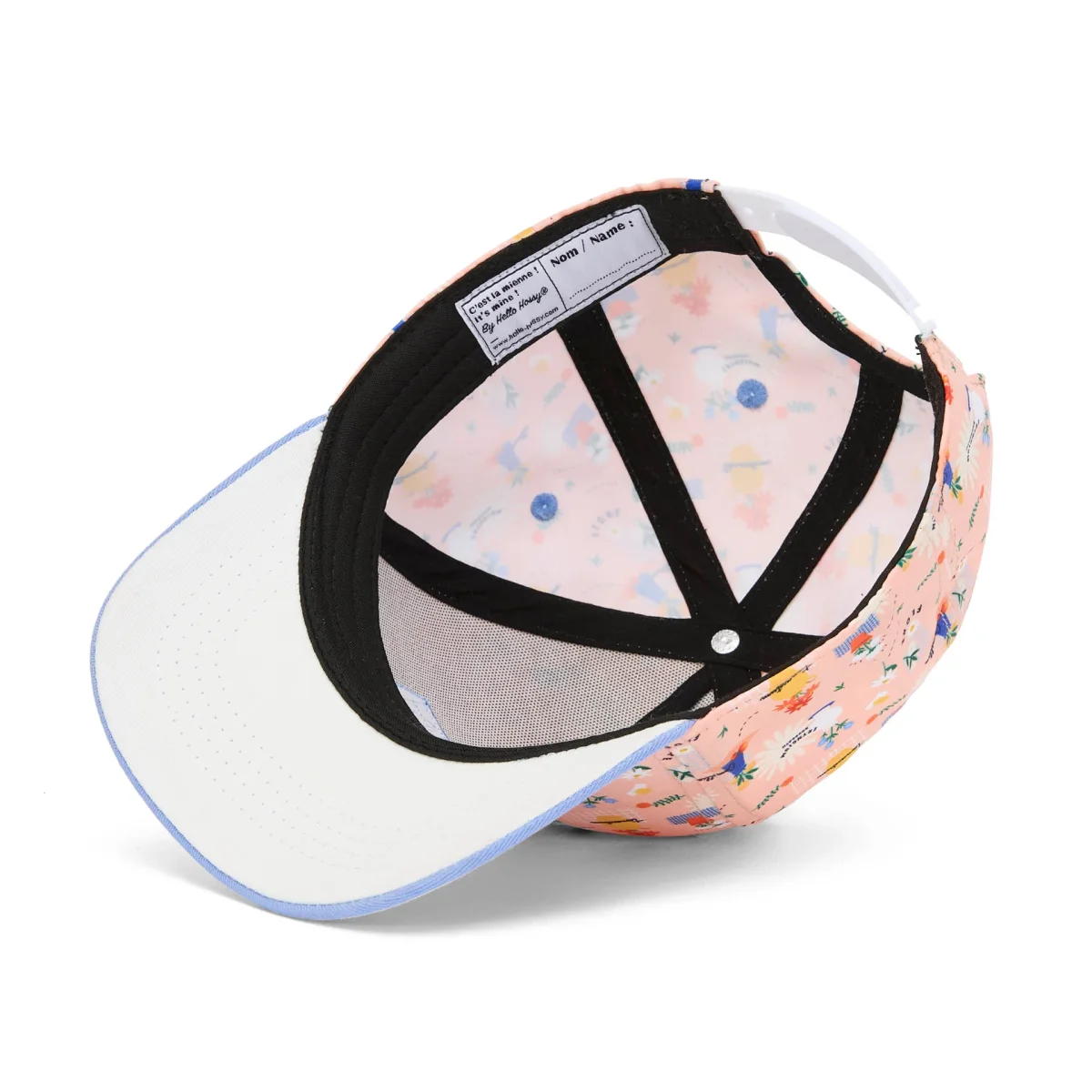 Cappellino rosa in cotone bio, con una stampa floreale carinissima! Cinturino posteriore regolabile in poliestere riciclato. Taglia 2-5 anni, veste da 48cm a 52cm di circonferenza. Taglia 6+, dai 52 ai 56cm di circonferenza.