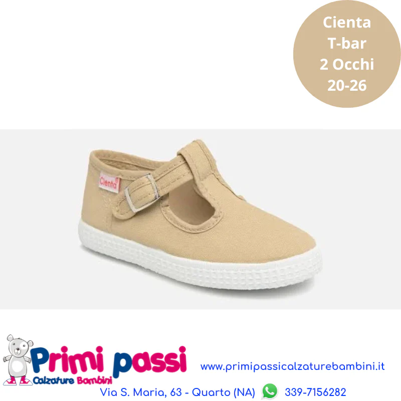 Guida alle Taglie Cienta Scarpa T-Bar, 2 Occhi da bambino di CIENTA. Tomaia in tela di cotone liscia color Pietra/beige. Chiusura con fibbia a pressione. Sottopiede foderato in tessuto, estraibile. Particolare che distingue questa calzatura รจ la profumazione della suola.