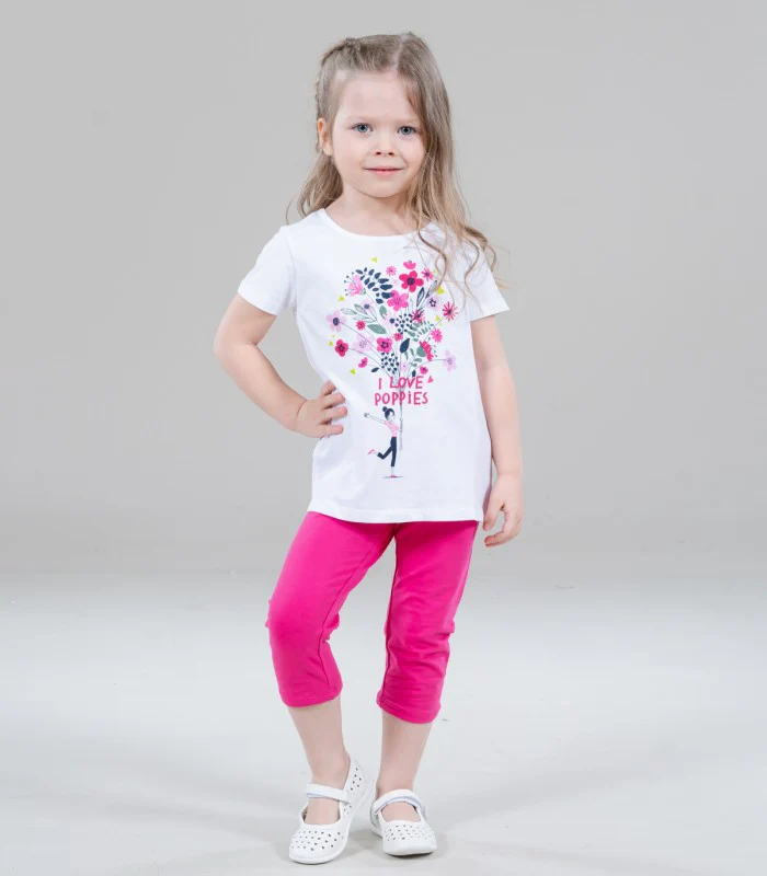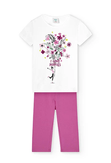 Completo di maglietta e legging da ciclismo da bambina. La maglietta รจ a maglia liscia con maniche corte color bianco e stampa di una bambina con fiori. I legging da ciclista sono color fucsia con elastico interno per una maggiore elasticitร .
