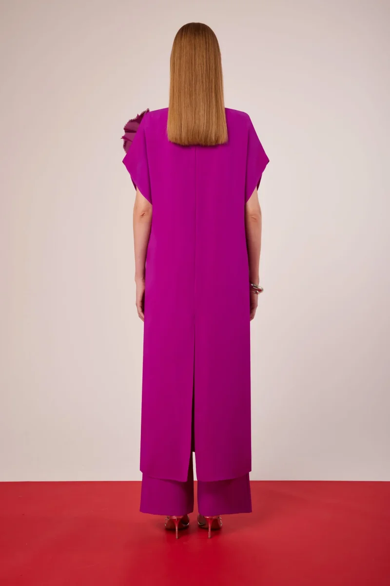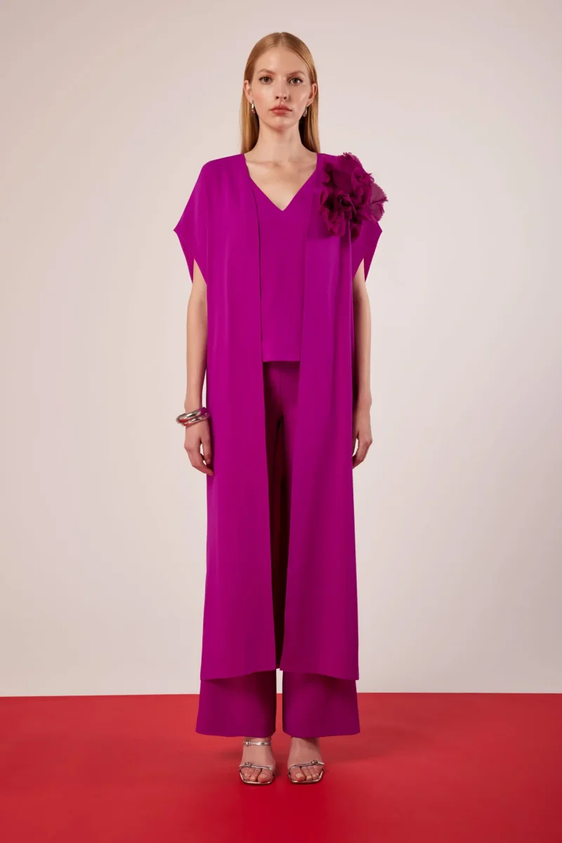 Questo completo firmato Carla Ruiz รจ un’elegante e sofisticata scelta per cerimonie ed eventi speciali. L’outfit รจ composto da tre pezzi principali: Top con scollo a V: dal taglio fluido e leggermente morbido, dona un tocco di raffinatezza. Pantalone palazzo: ampio e leggero, garantisce comoditร e movimento armonioso. Soprabito lungo senza bottoni: caratterizzato da maniche ampie e un design aperto sul davanti, dona un effetto etereo e sofisticato. Il punto focale del look รจ l’applicazione floreale 3D sulla spalla, che aggiunge un dettaglio scenografico e ricercato. Il colore fucsia intenso esprime femminilitร ed eleganza, mentre gli accessori metallici, come i…