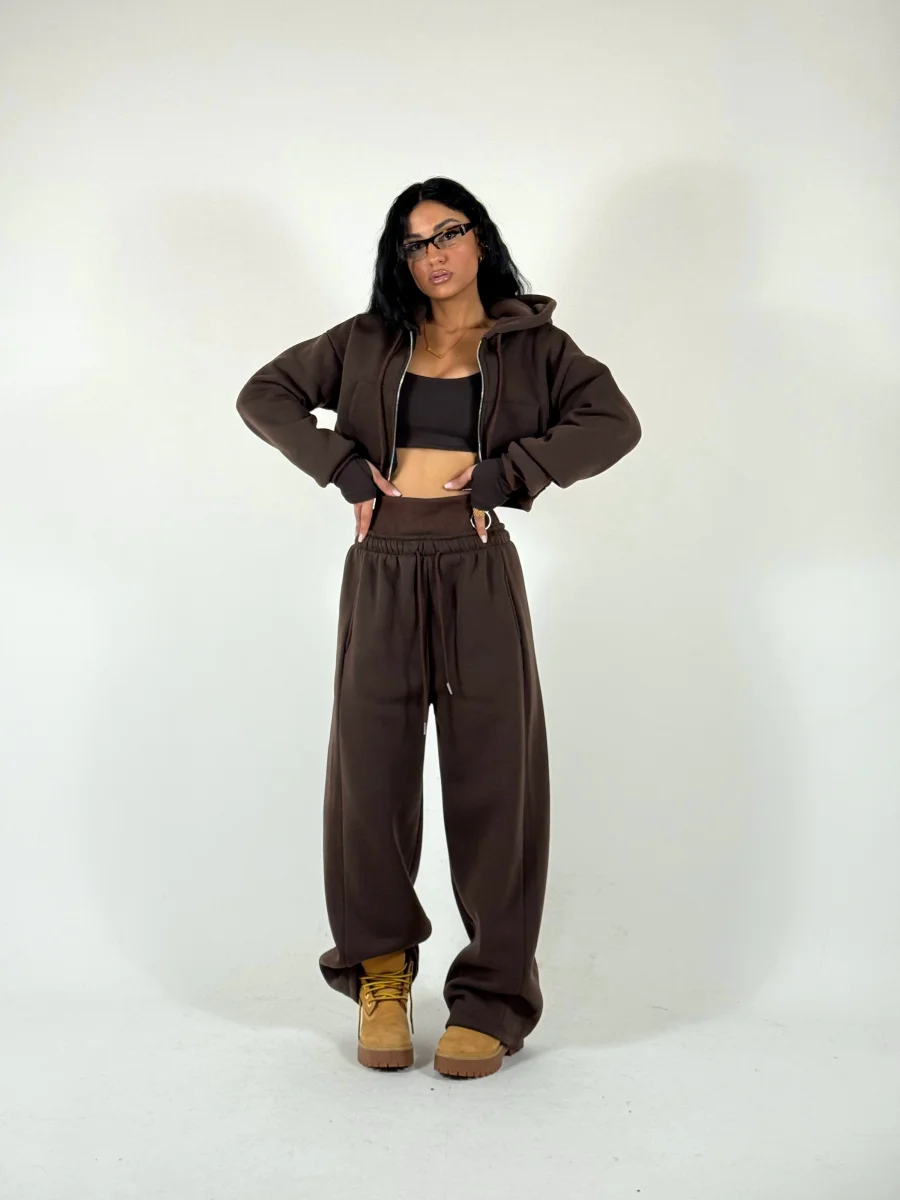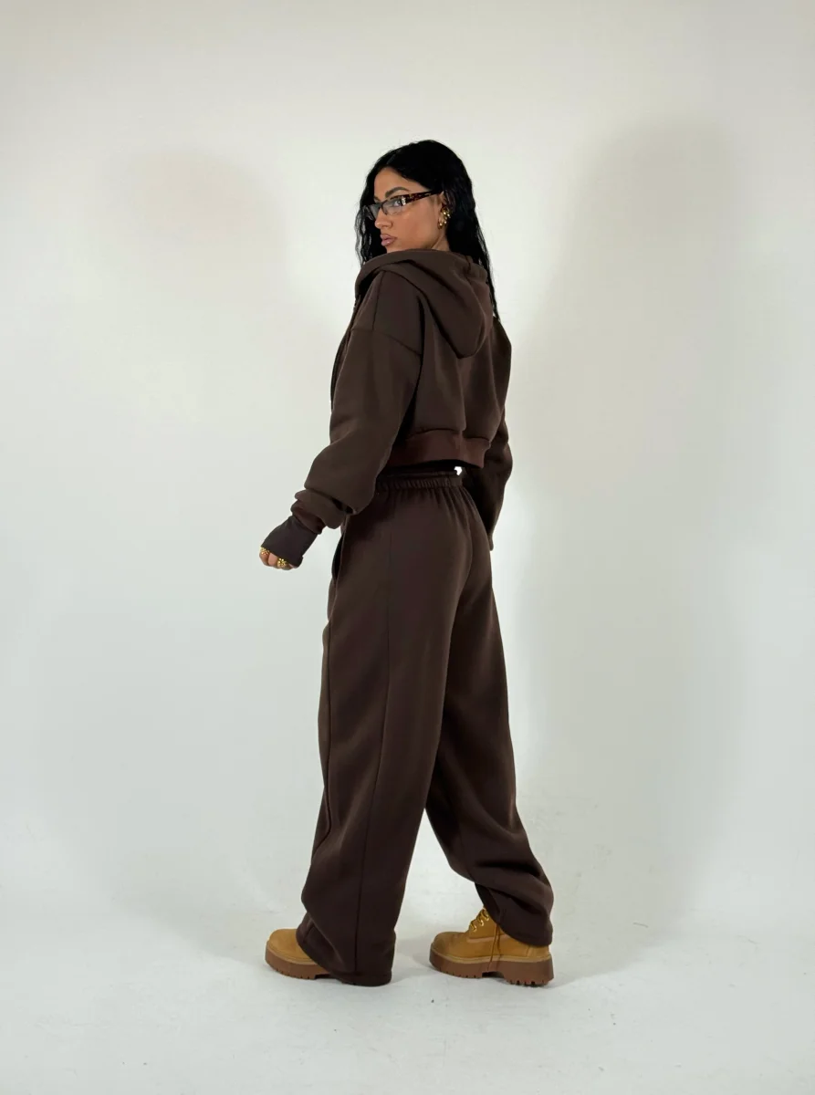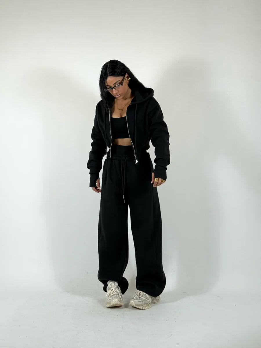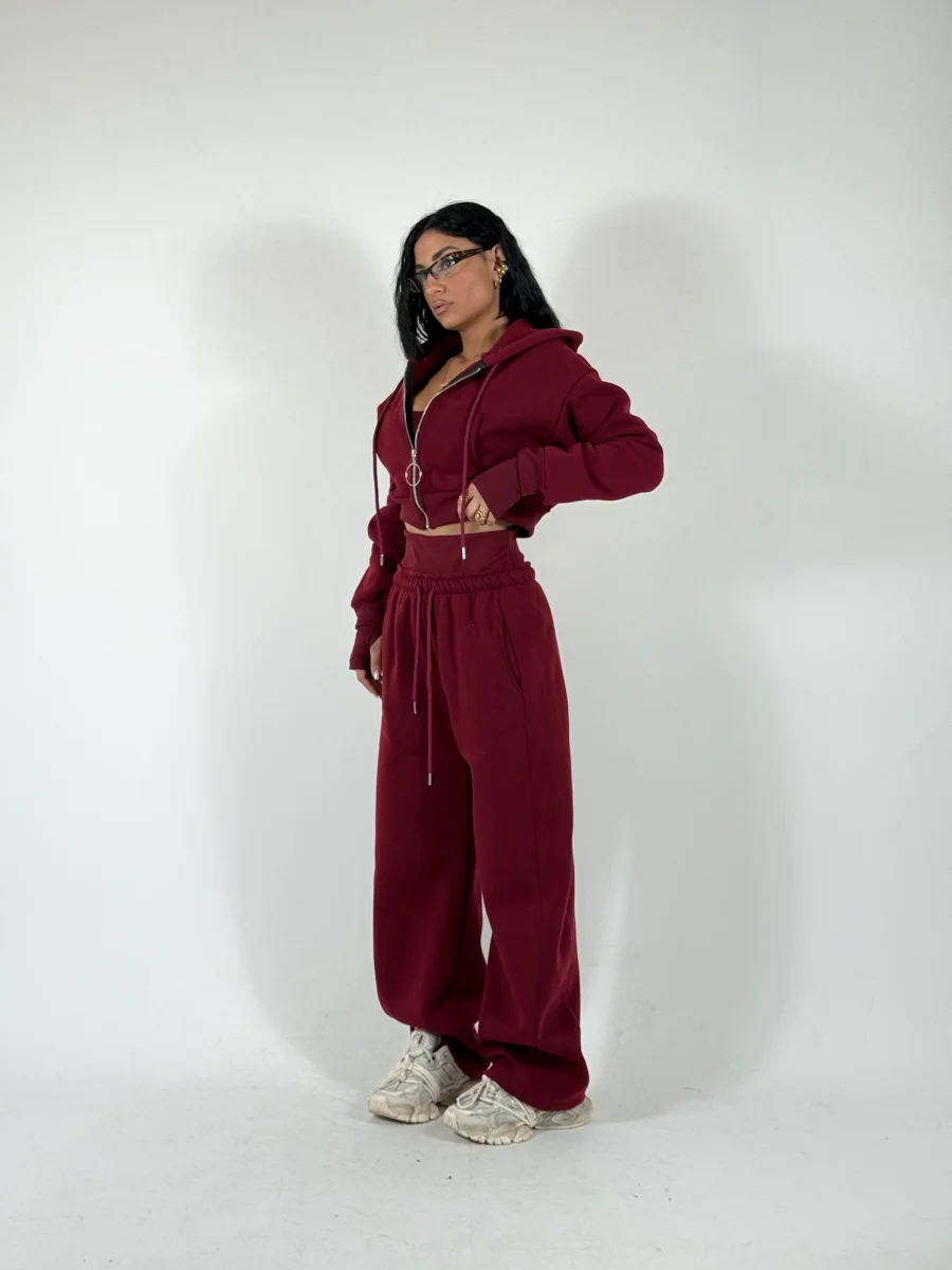 Coordinato di tuta a tre pezzi felpato allโ€™interno in pile composto da felpa corta con zip e cappuccio, crop top in cotone con manica a guanto, pantaloni palazzo con elastico a costine in vita doppio, vestibilitร  consigliata fino a taglia 46.