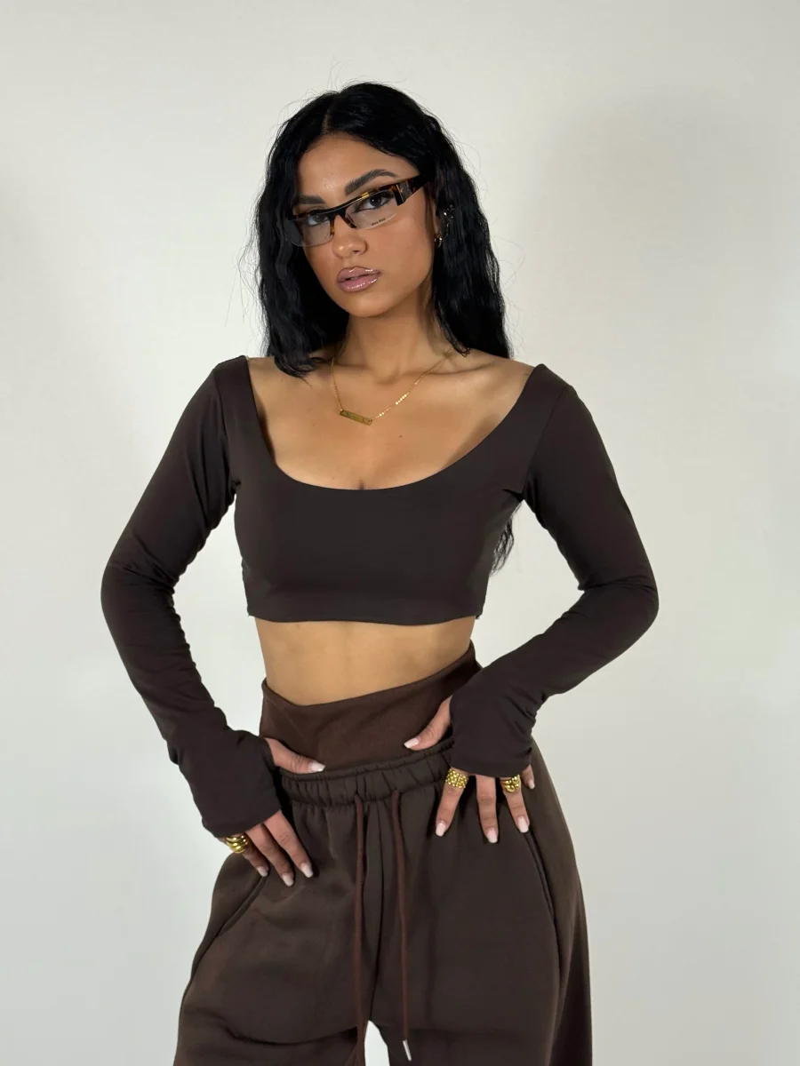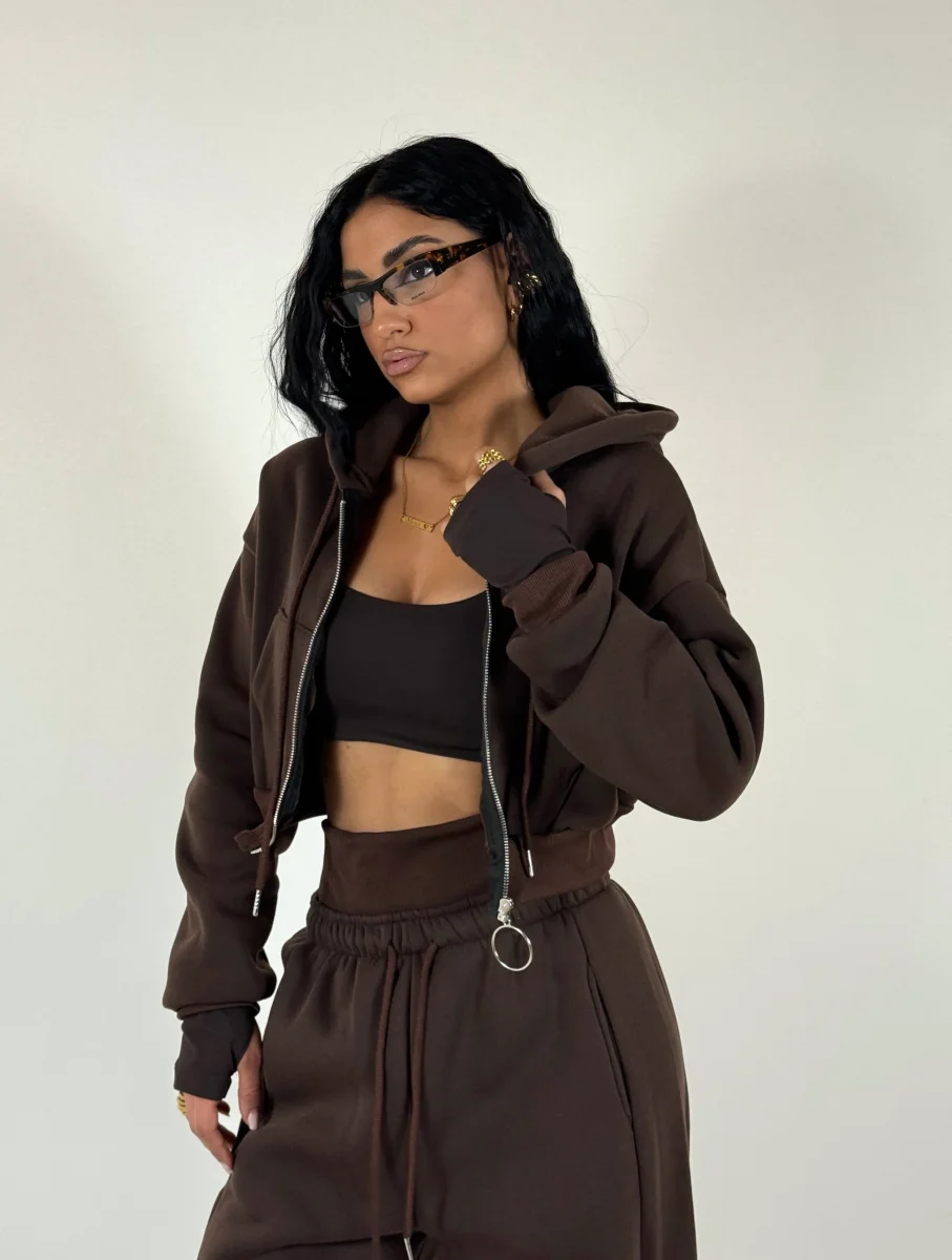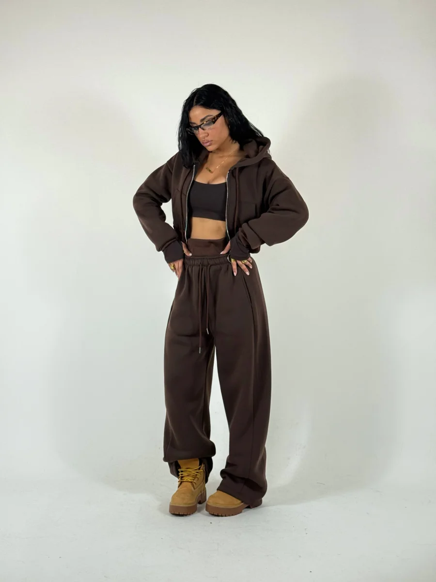 Coordinato di tuta a tre pezzi felpato allโ€™interno in pile composto da felpa corta con zip e cappuccio, crop top in cotone con manica a guanto, pantaloni palazzo con elastico a costine in vita doppio, vestibilitร  consigliata fino a taglia 46.
