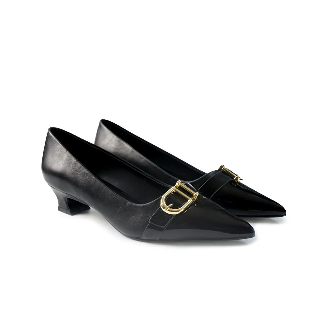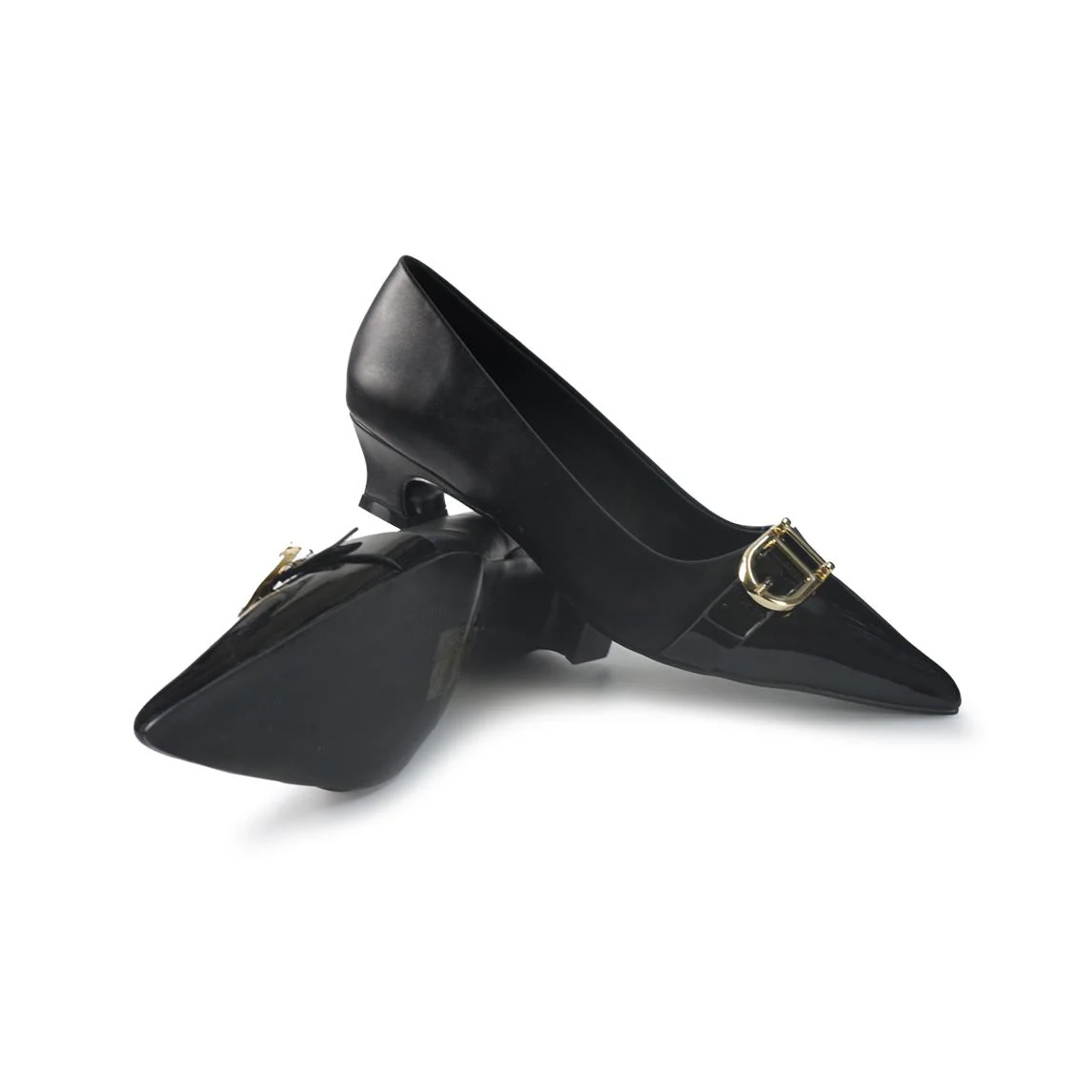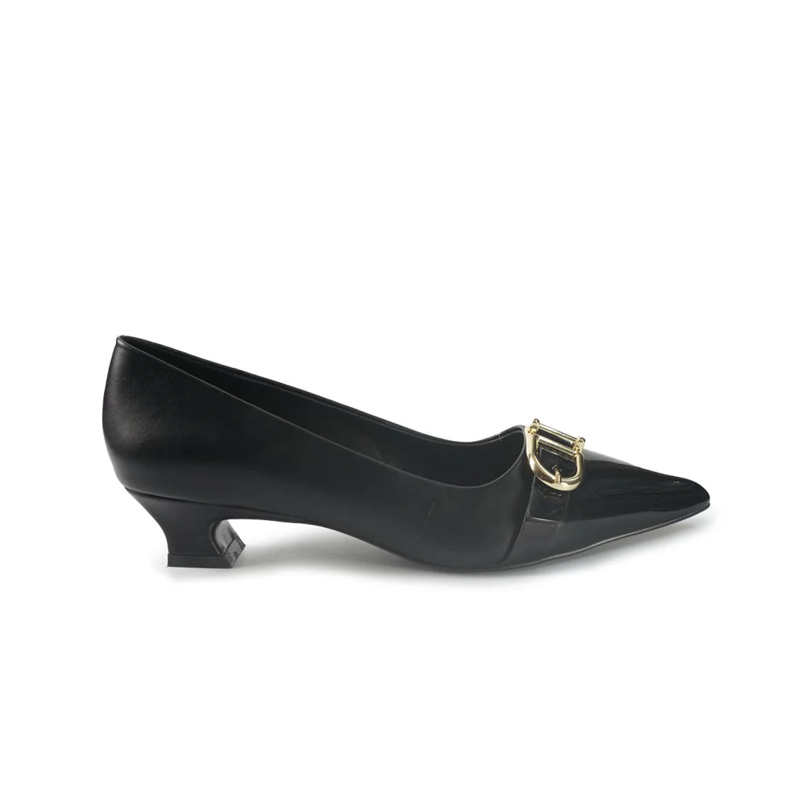 Decollete a punta in ecopelle con tacco rocchetto e accessorio fibbia applicata in punta. Fondo gomma flessibile e antiscivolo.