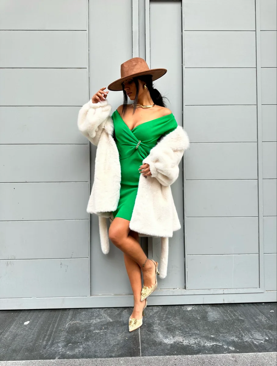 Abito in lana pettinata scollo a V, incrocio fiocco sul davanti e dettaglio catena oro, vestibilitร elastica consigliata fino a taglia 46.