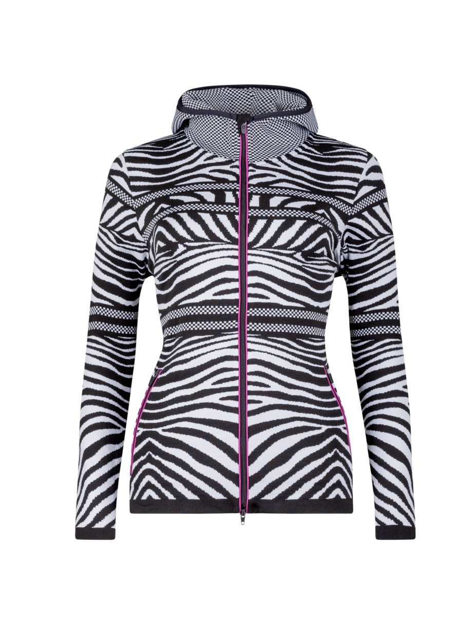 Felpa termoregolante realizzata nel tessuto tecnico DHtech 400. L’esclusivo jacquard animalier all over e la zip lunga con tasche e cappuccio rendono questo capo estremamente trendy e funzionale. Il polipropilene, filato con il quale viene realizzata, รจ a basso impatto ambientale e di facile manutenzione, si asciuga molto velocemente e non si stira. Ideale come secondo strato per qualsiasi tipo di attivitร fisica al freddo in quanto garantisce grande traspirabilitร e mantiene la temperatura corporea costante.