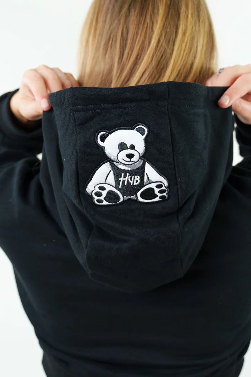 il ricamo HYB sul petto, essenziale e preciso, e lโ€™iconico orsetto HYB ricamato sul cappuccio, un dettaglio unico che dona al capo personalitร  e riconoscibilitร  immediata.