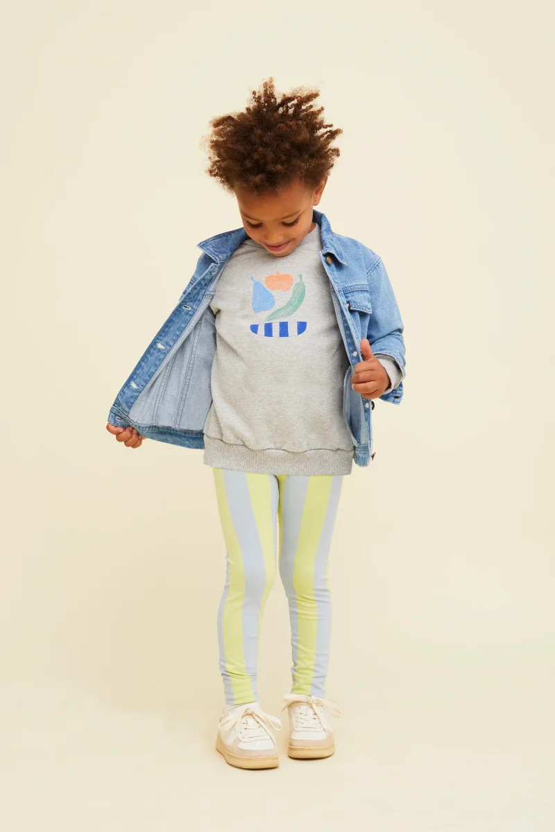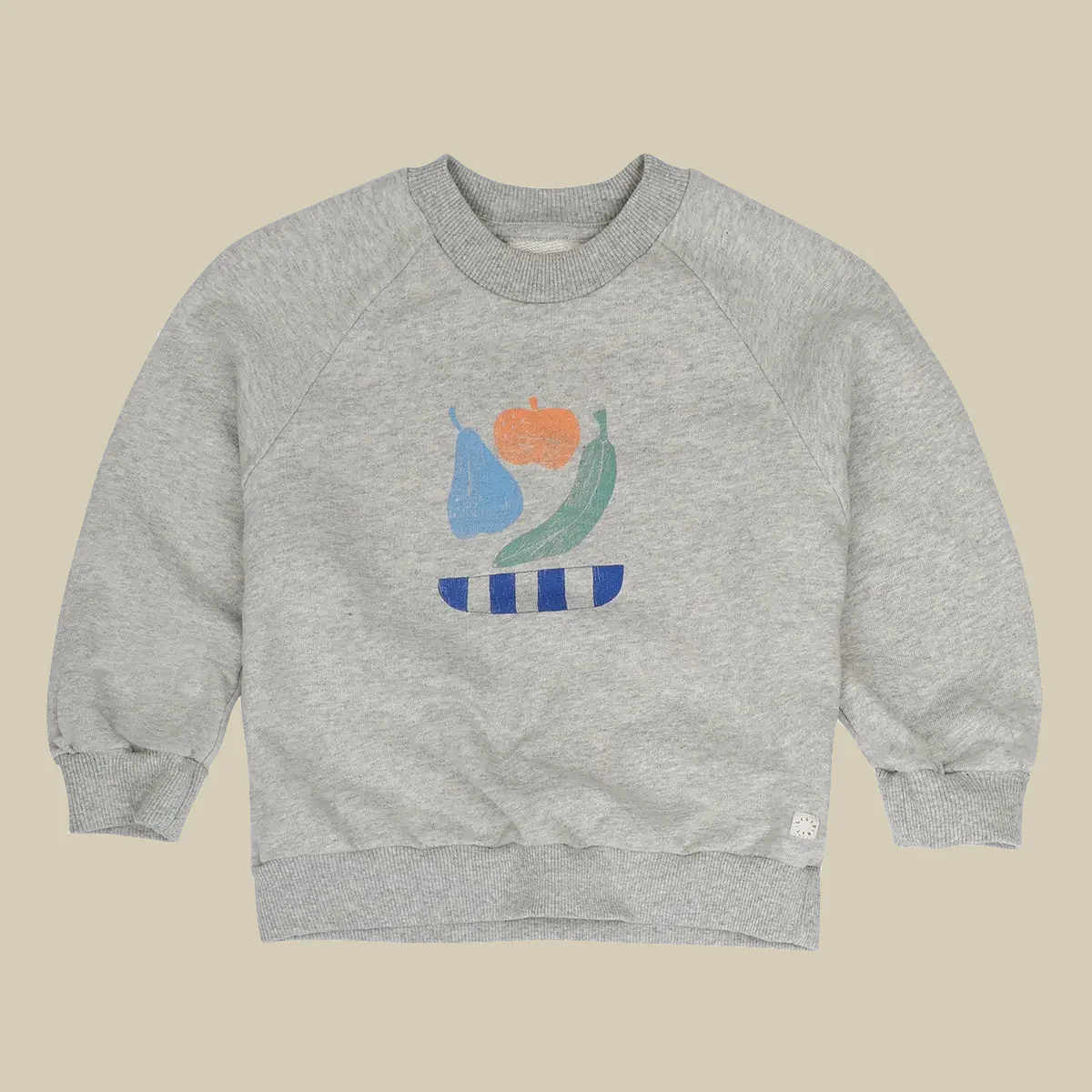 Felpa girocollo grigia melange, caratterizzata da maniche lunghe raglan e dalla giocosa stampa โfruit bowlโ sul davanti. Realizzata al 100% in cotone organico, รจ un capo comodo e realizzato su misura per garantire comfort ai vostri bambini!