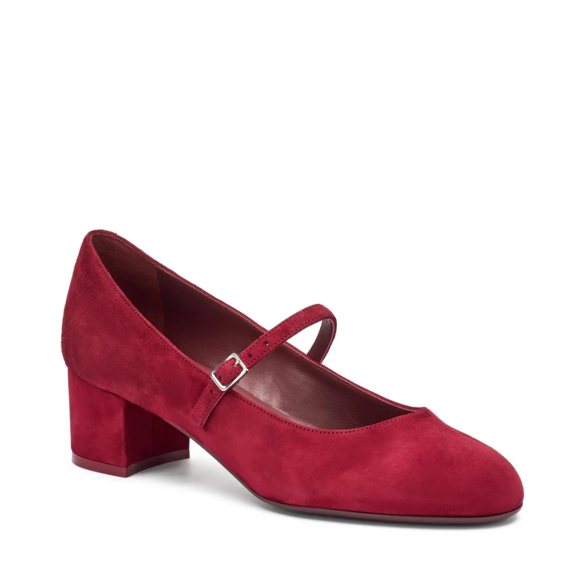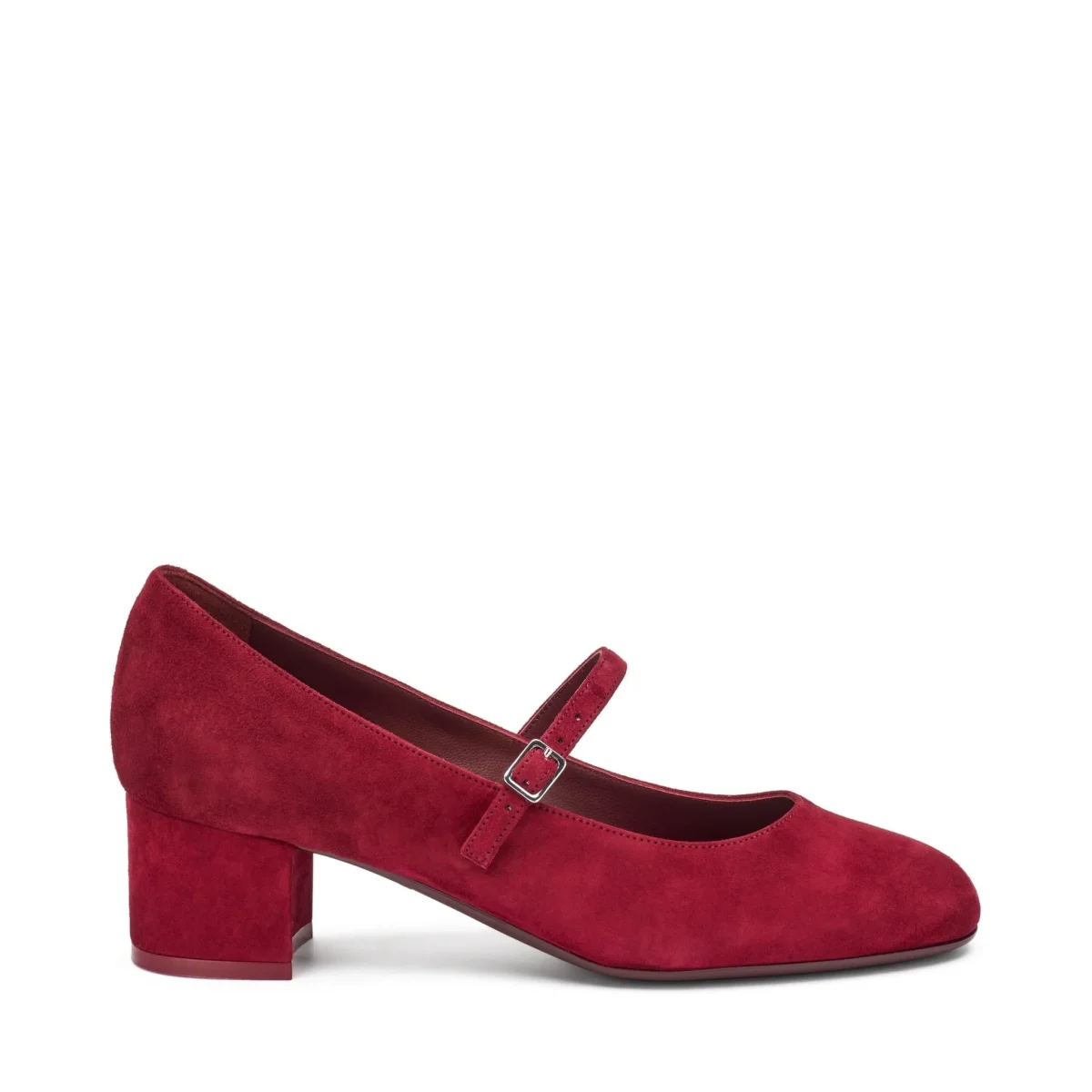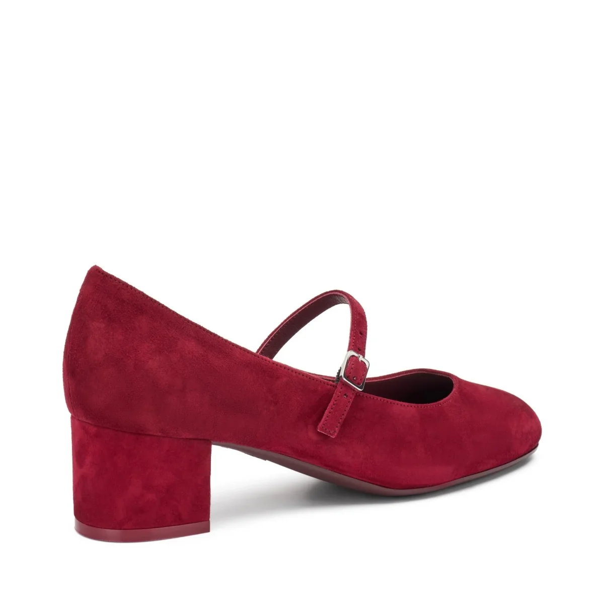 Mary Jane in camoscio con tacco fasciato in tinta e cinturino sul collo piede. Fondo gomma flessibile e antiscivolo.