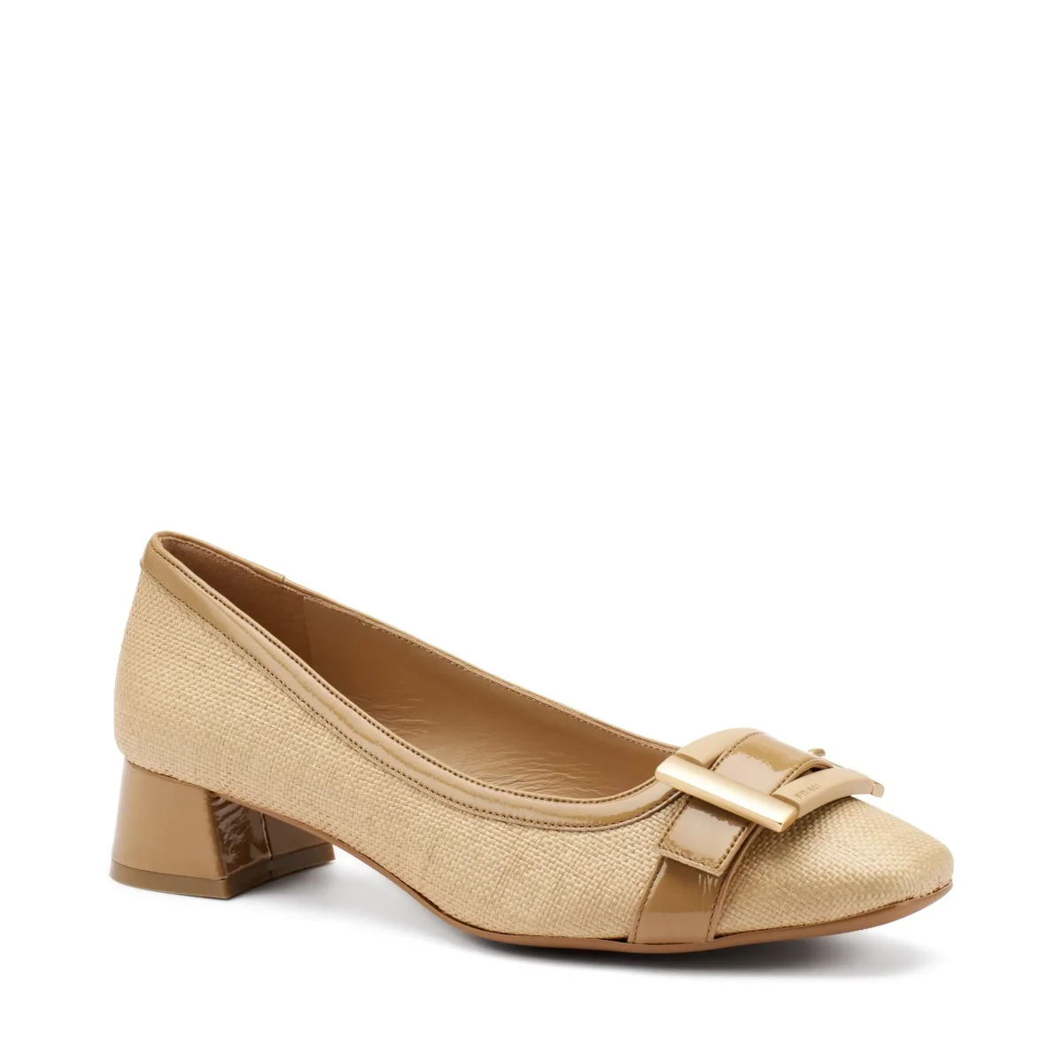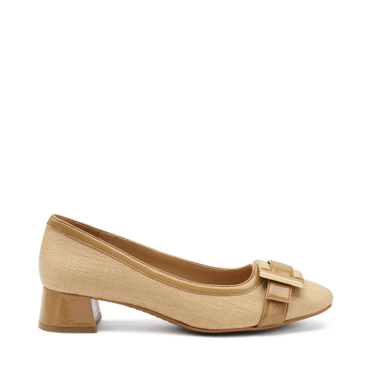 Decolletè in tessuto e vernice con tacco e fibbia in tinta. Fondo gomma flessibile eantiscivolo.