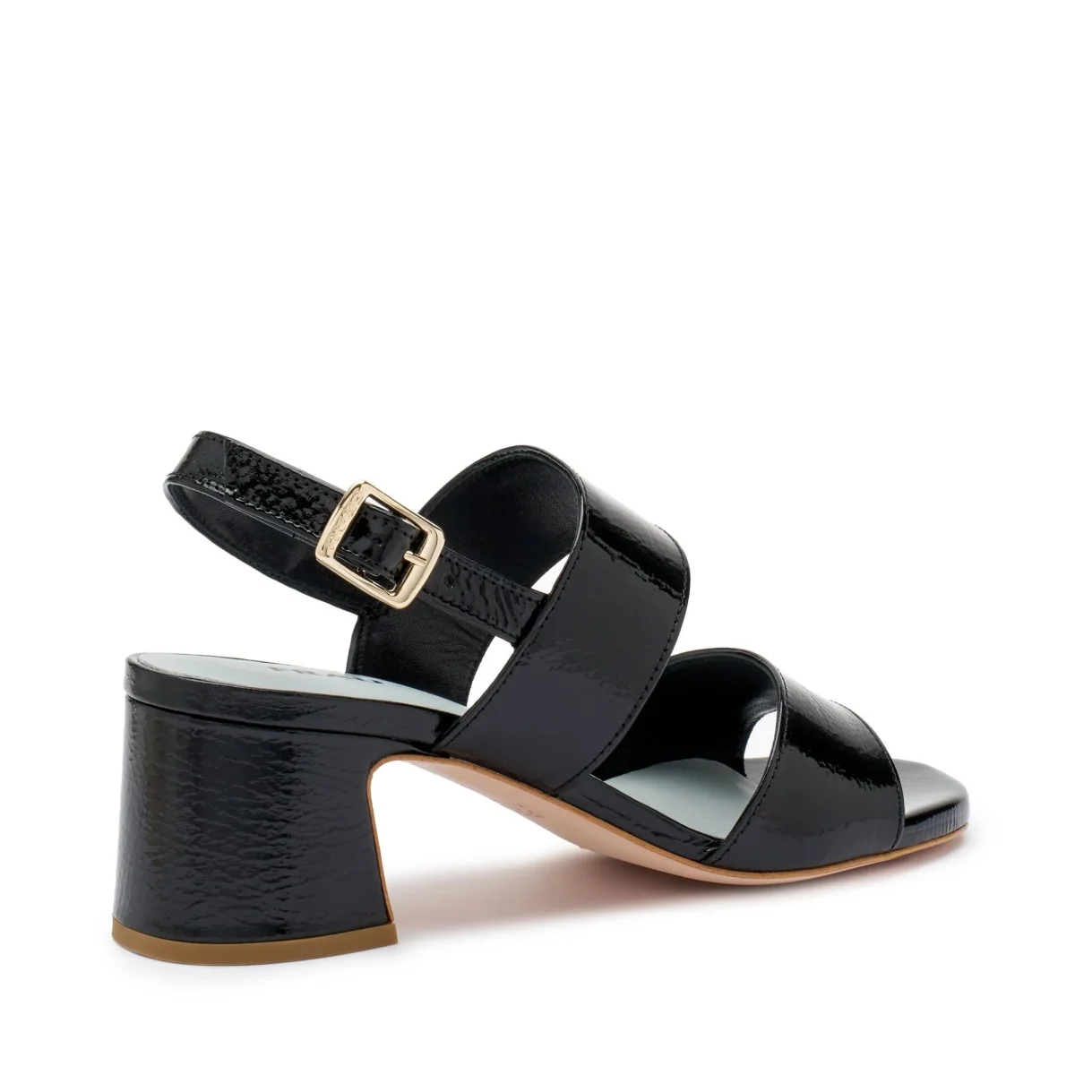 Sandali in vernice con tacco fasciato in tinta e cinturino al tallone. Fondo gomma flessibile e antiscivolo.