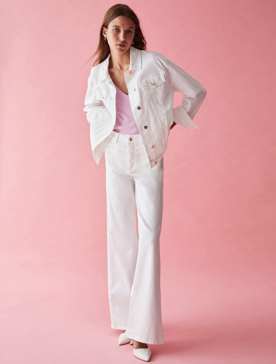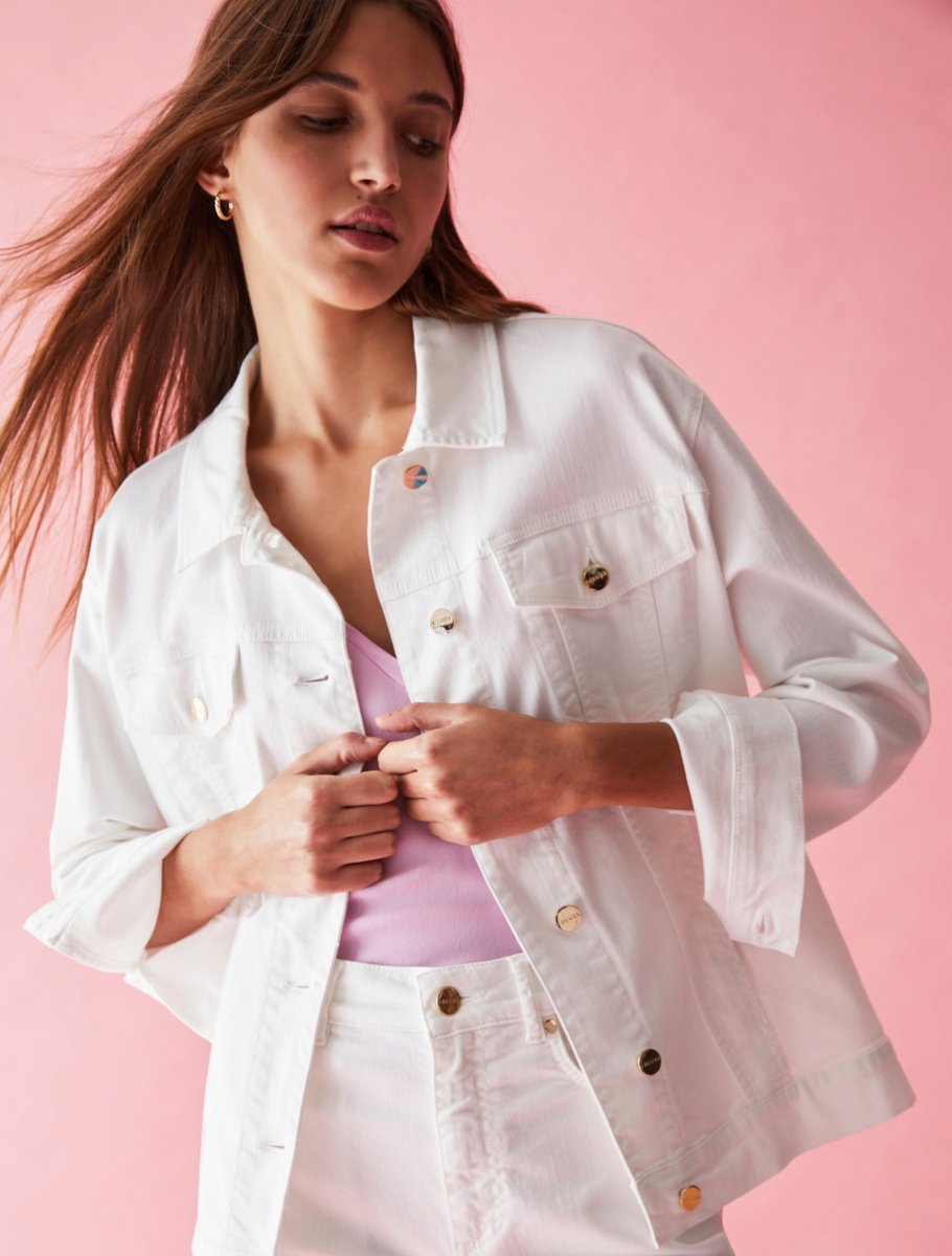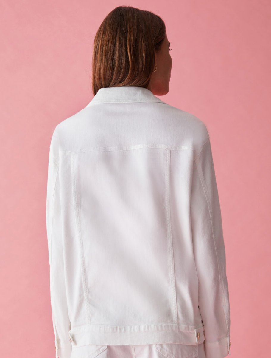 Giacca donna Iblues in tela di cotone stretch dalla linea dritta, chiusa con bottoni a chiodo. Collo a camicia e maniche lunghe con spalle scese. Tasche inserite nei fianchi e taschini con patta e bottone sul petto. Tessuto contenente cotone proveniente da una catena di fornitori impegnati in unโagricoltura a basso impatto ambientale. Tonalitร disponibile in Store: Bianco