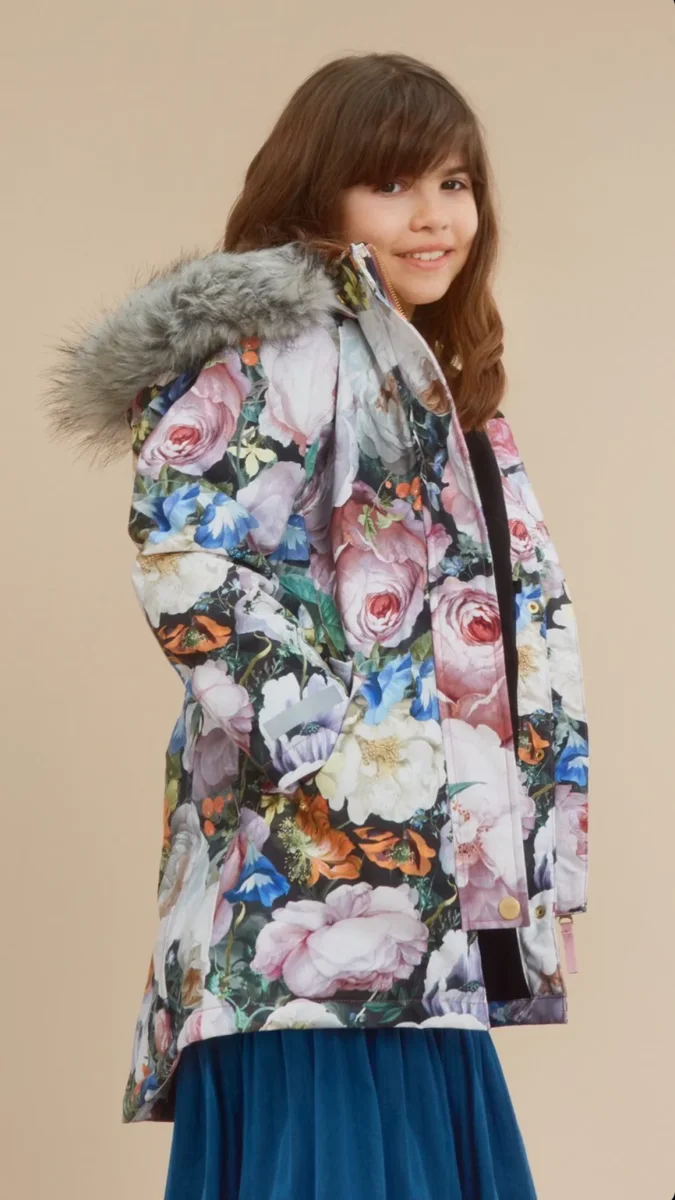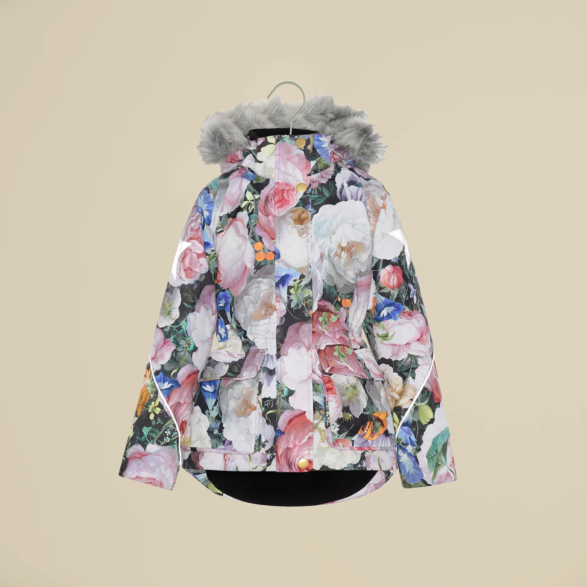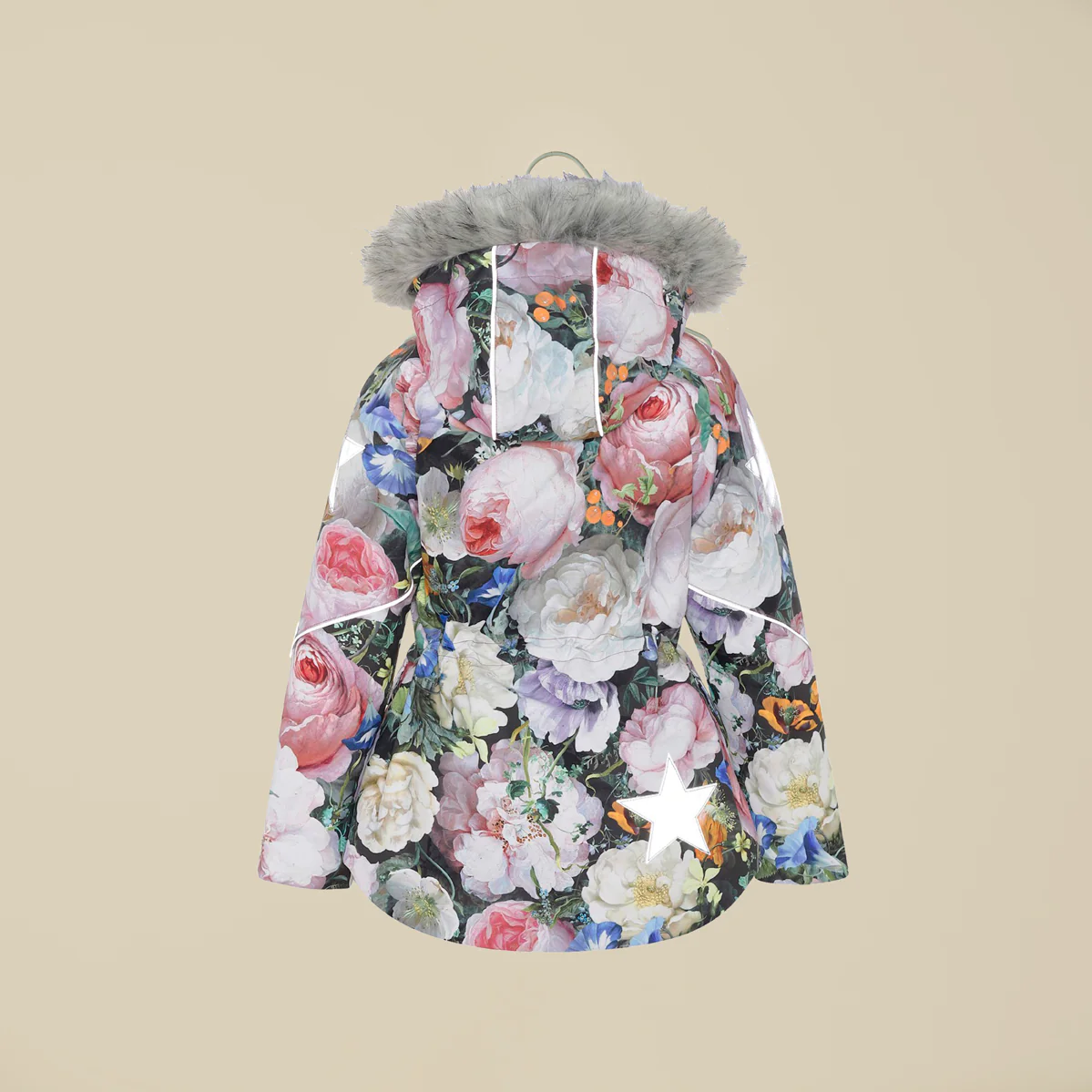 Giaccone imbottito con stampe a fiori e cappuccio in faux fur, tutto staccabile. Zip sul davanti ed coulisse in vita e stelle riflettenti sulla maniche e sul retro.