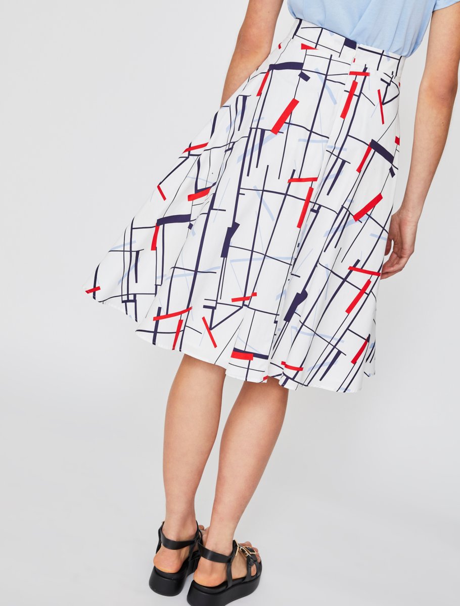 Gonna corta Iblues in popeline di cotone stampato dalla linea a ruota, chiusa con zip invisibile sul retro. Tessuto contenente cotone biologico, fibra ricavata dalla coltivazione biologica della pianta del cotone. Tonalitร disponibile: Bianco