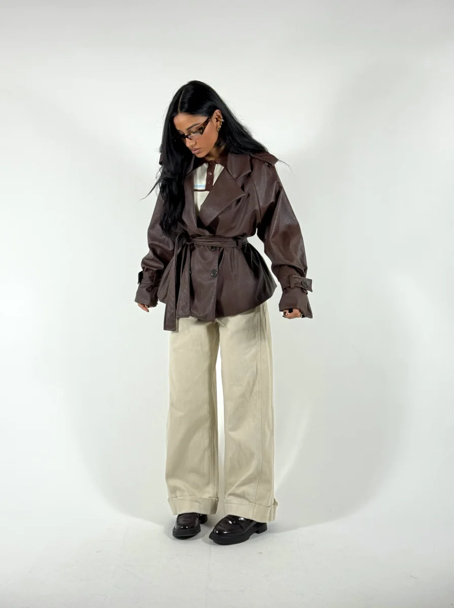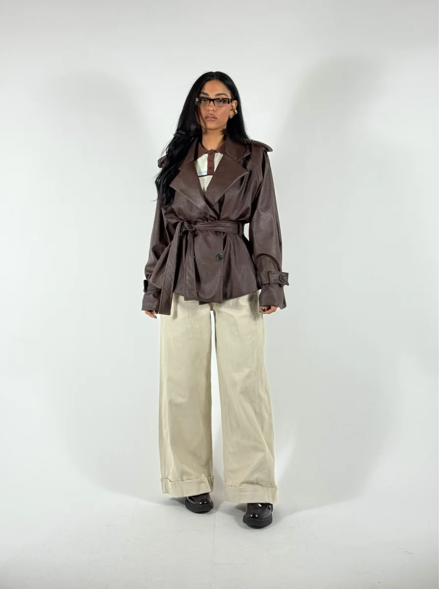 Jeans a palazzo con piegone, cintura inclusa, vestibilitร non elastica, consigliata fino a taglia 44/46. La modella indossa taglia XS.