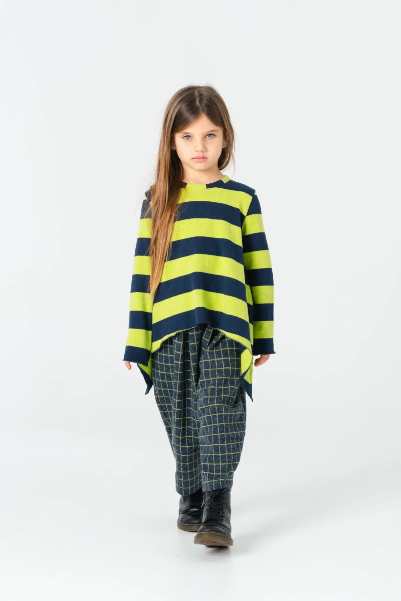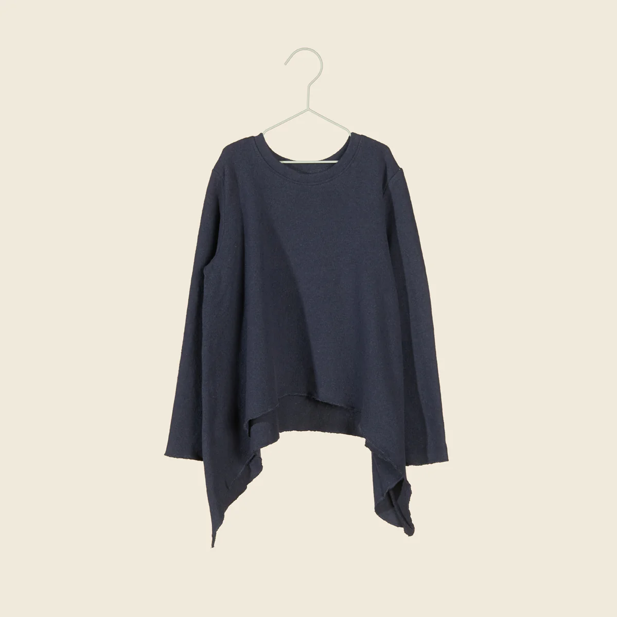 Maglia in caldo cotone blu navy, piรน lunga sui lati. Morbida e svasata per un look grintoso e comodo.