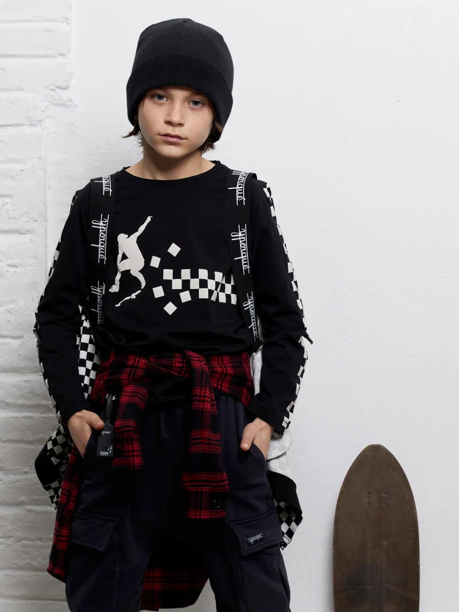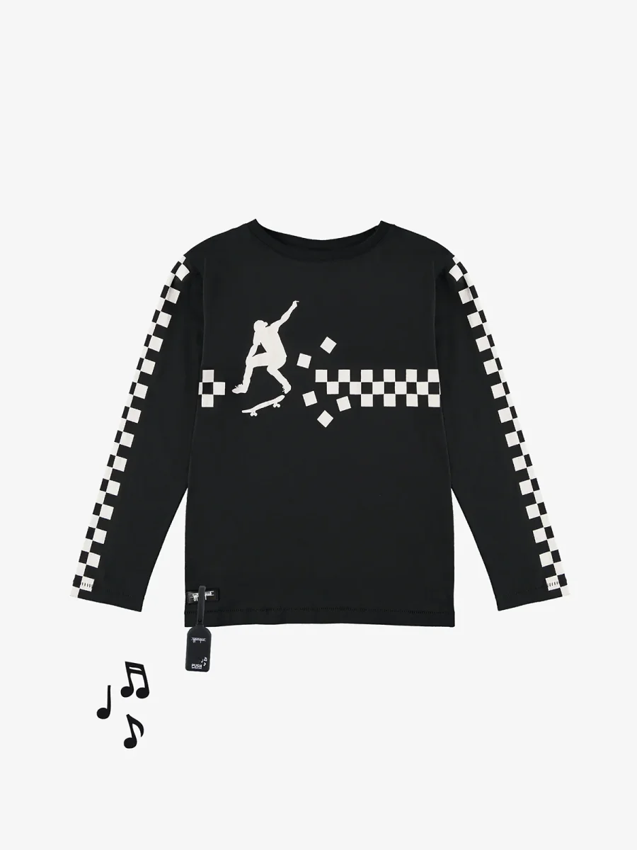 Una maglietta sonora, unica, a maniche lunghe con skater.