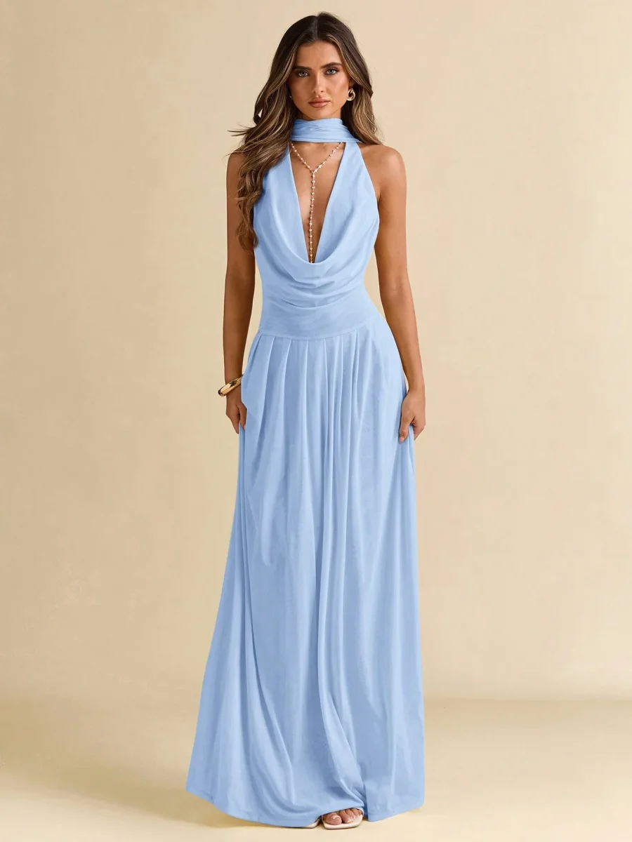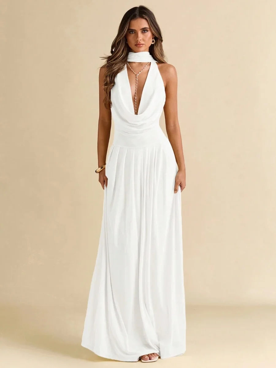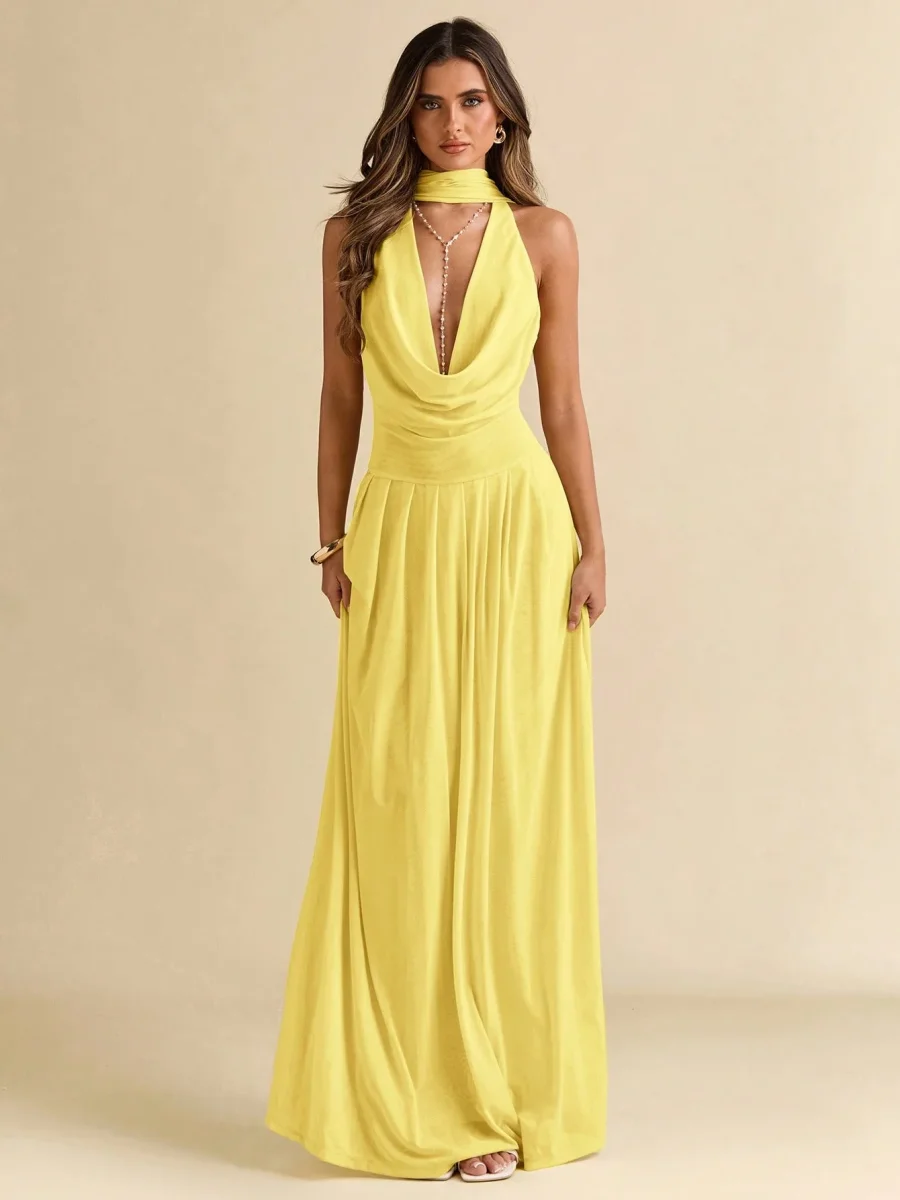 Lasciatevi sedurre da questo abito lungo perfetto per passeggiare in cittร  o per fuggire al mare. Il suo taglio fluido e la schiena schiena nuda per un’eleganza naturale, mentre la scollatura a V scollatura a V esalta sottilmente la silhouette.