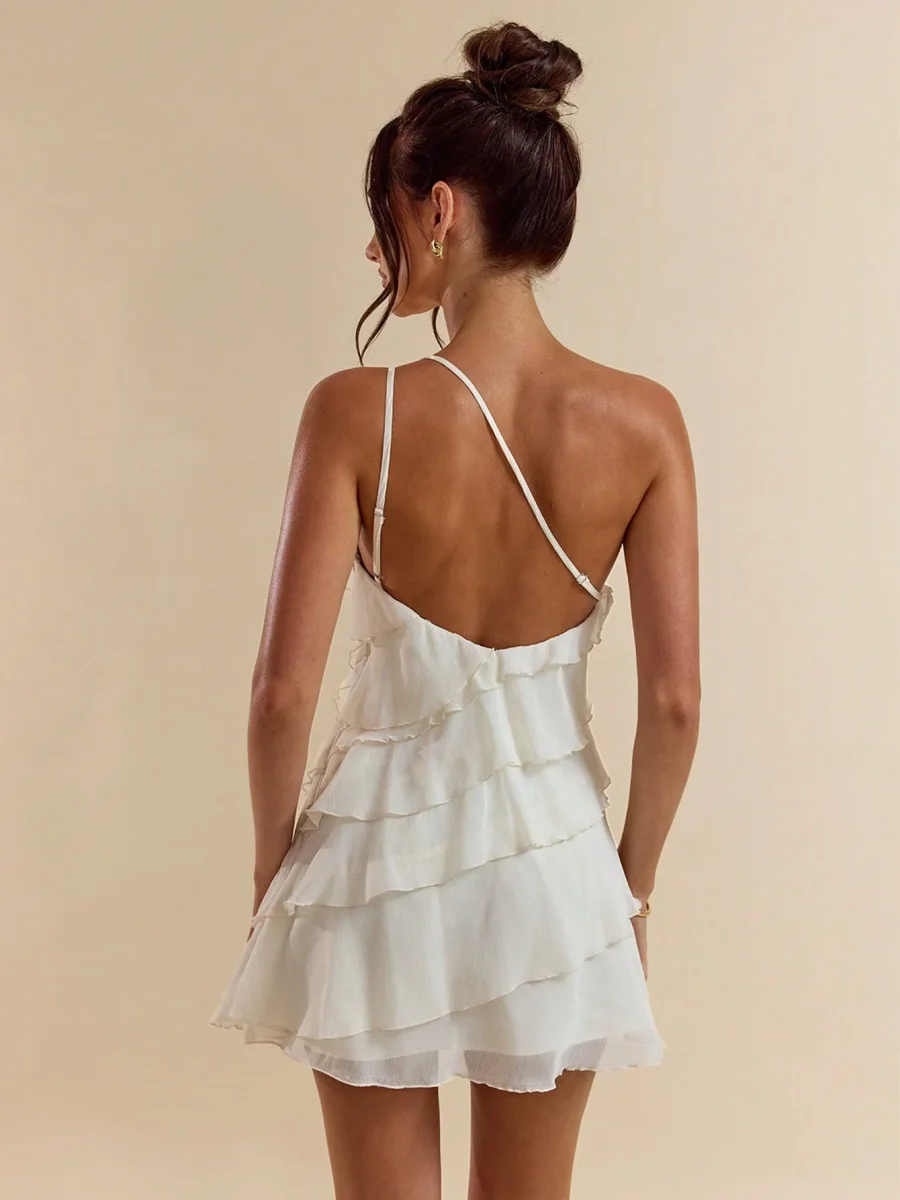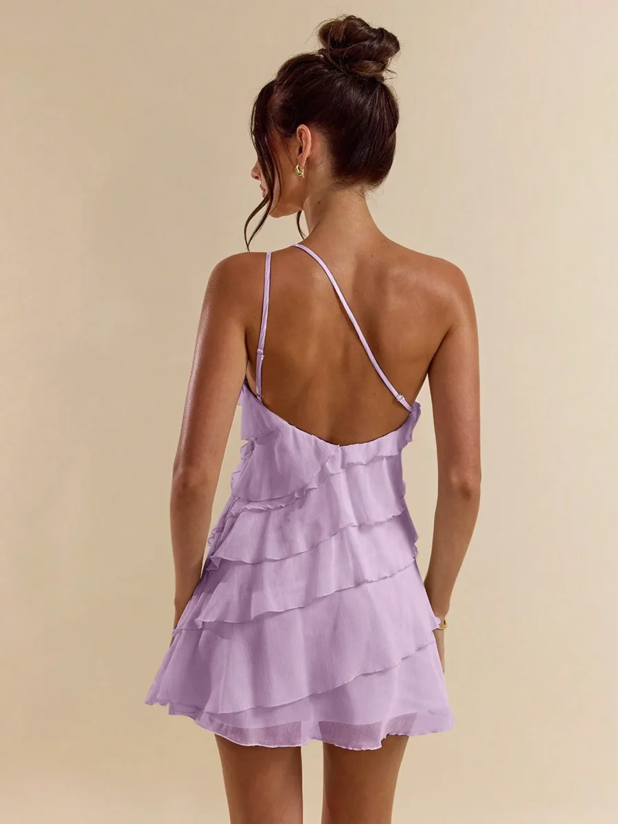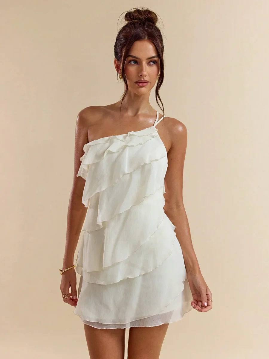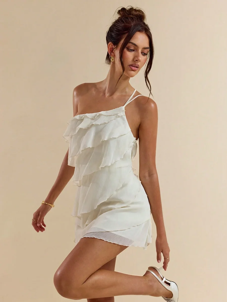 Leggero, giocoso e irresistibilmente glamour, questo abito corto abito corto con volant sovrapposti e scollo asimmetrico รจ un concentrato di femminilitร .