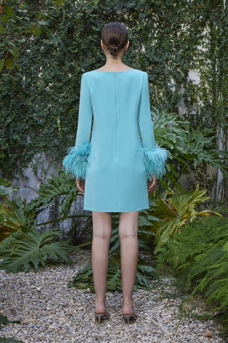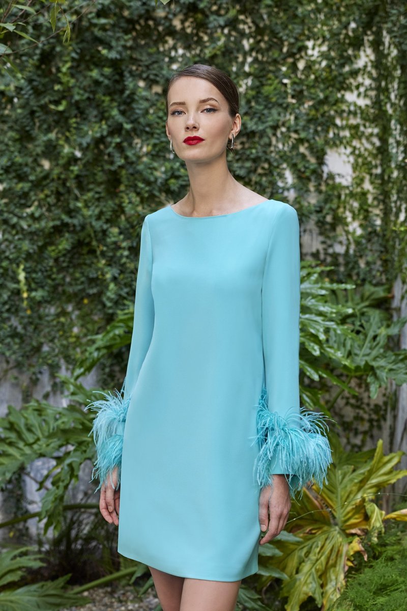 Bellissimo abito turchese Carla Ruiz con piume.
