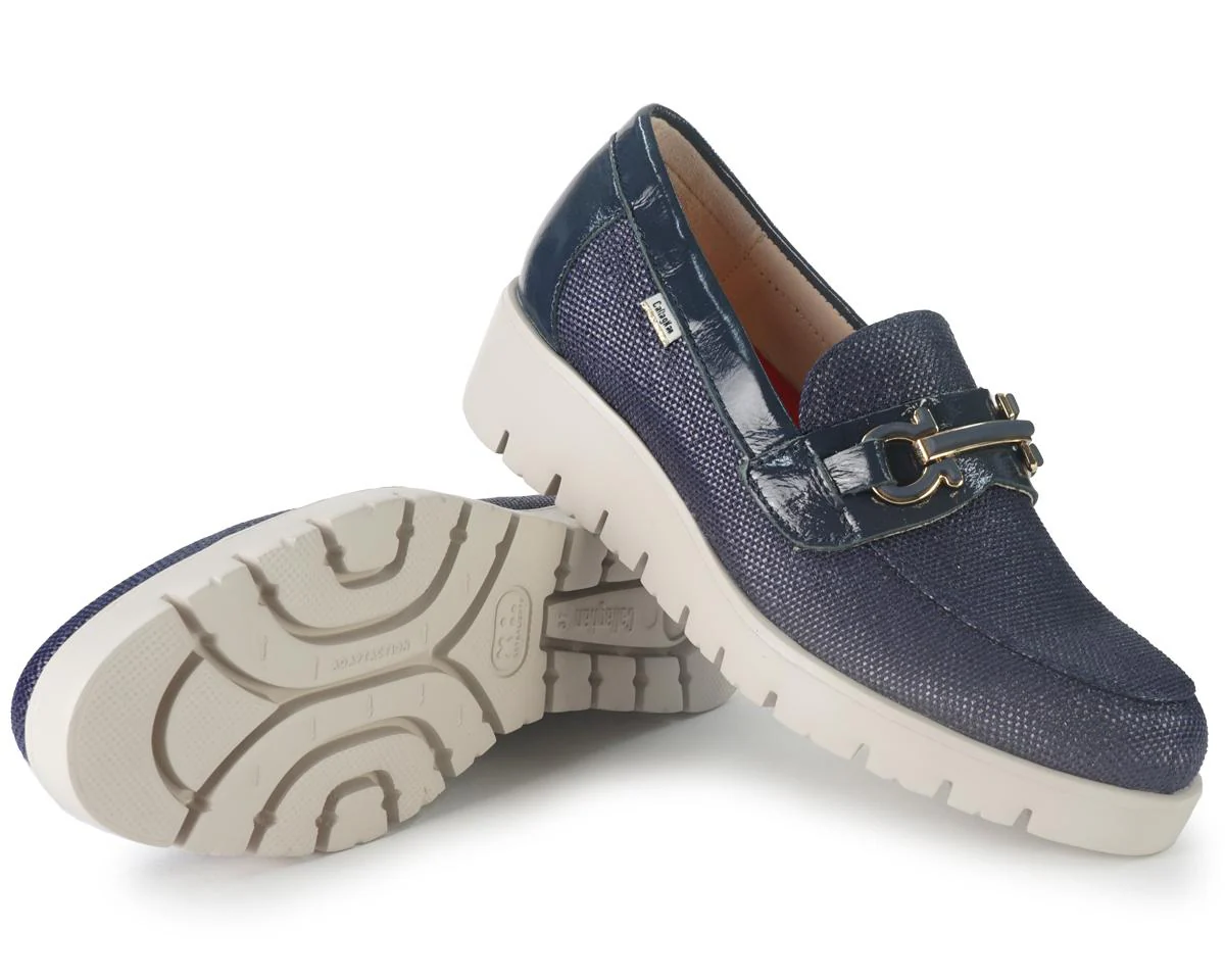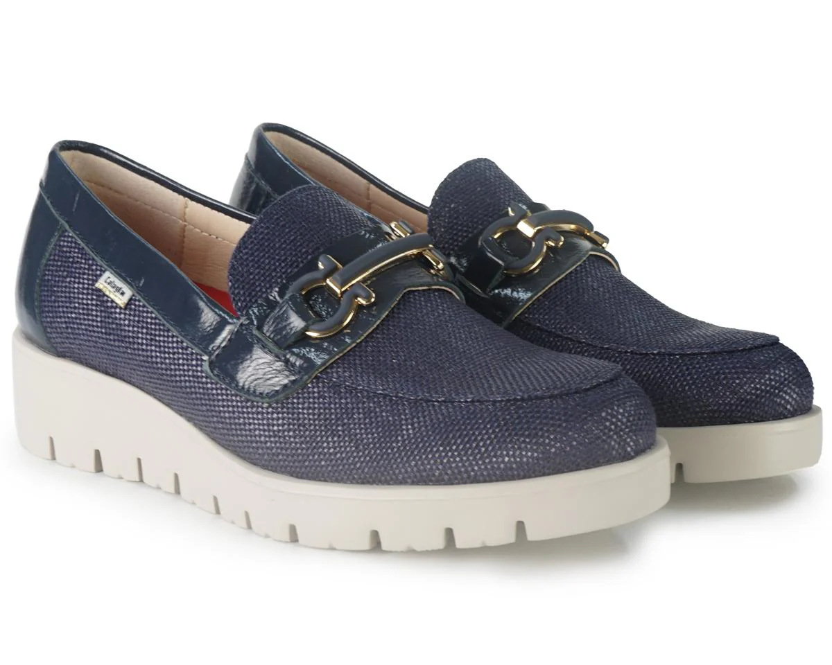Mocassino con zeppa e morsetto in metallo in tinta. Soletta estraibile con sistema Adaptaction.