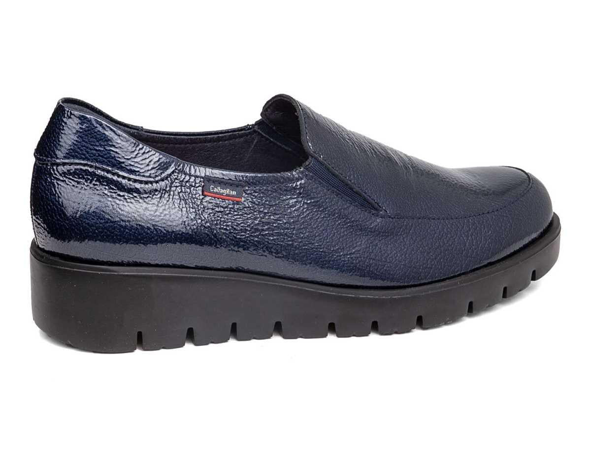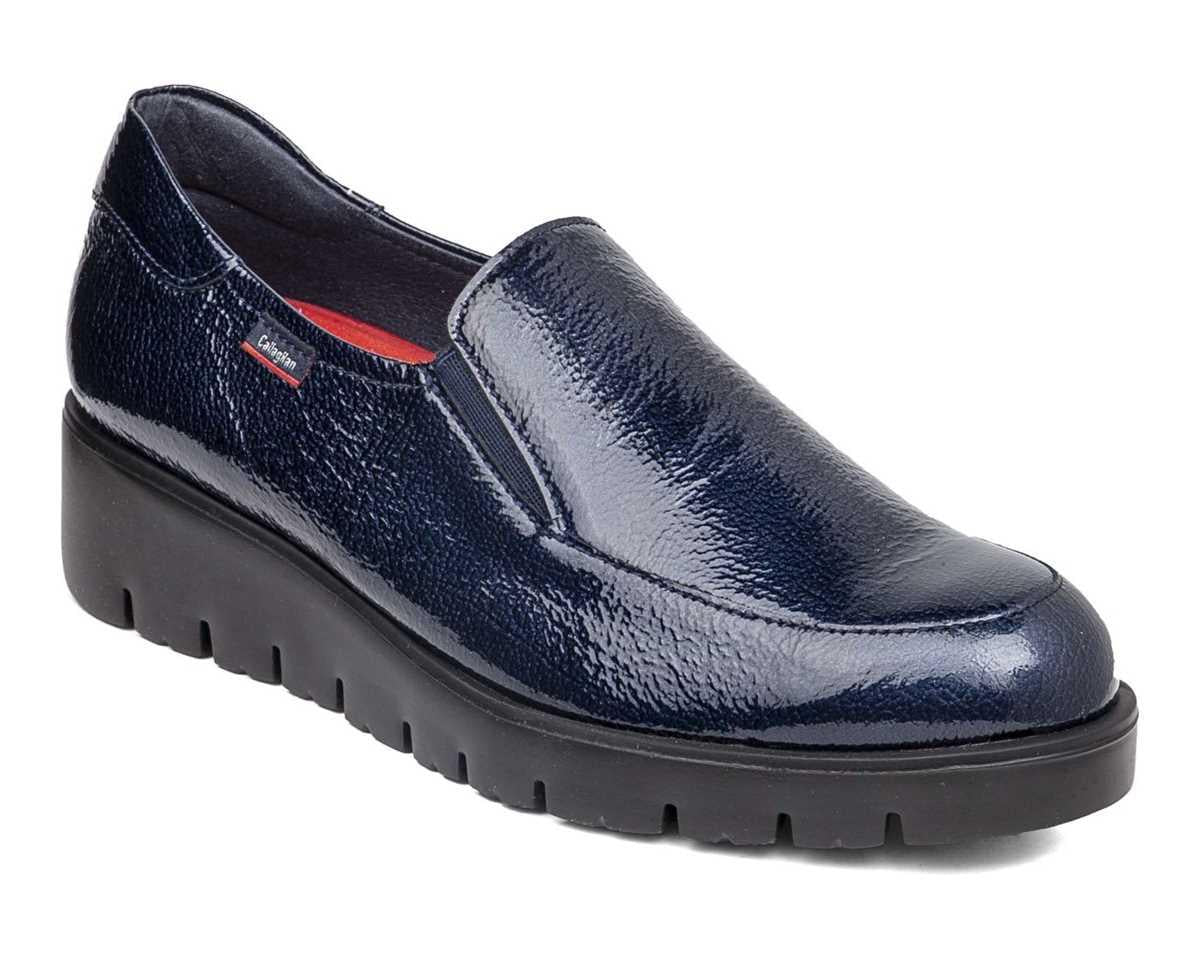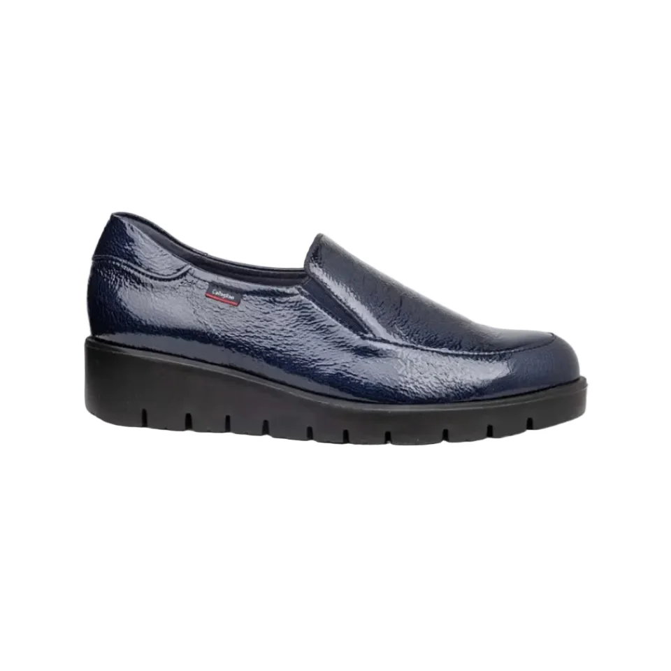 Mocassino Slip On in pelle vernice con zeppa e fondo gomma brevettato Adaptaction e soletta memory foam estraibile.