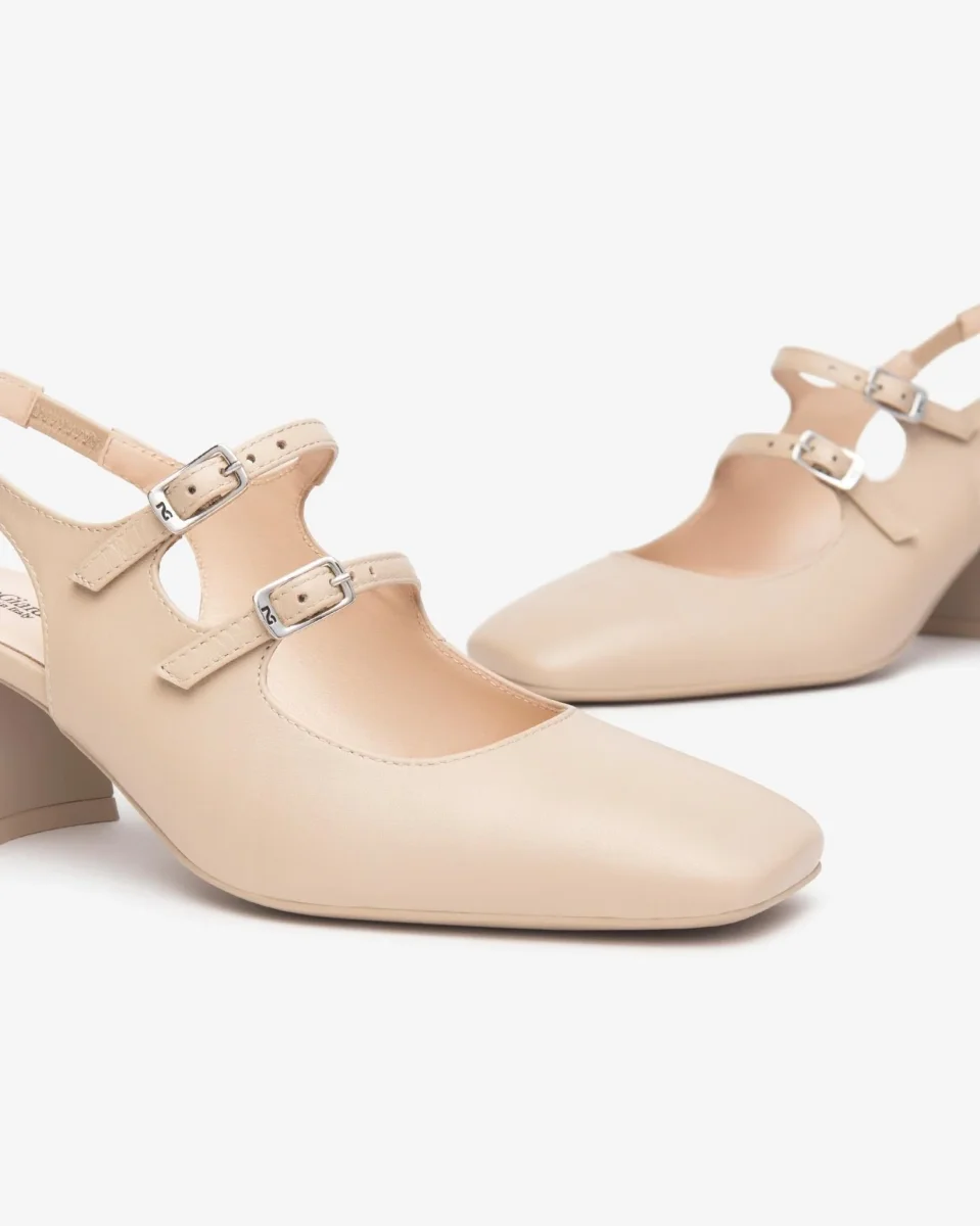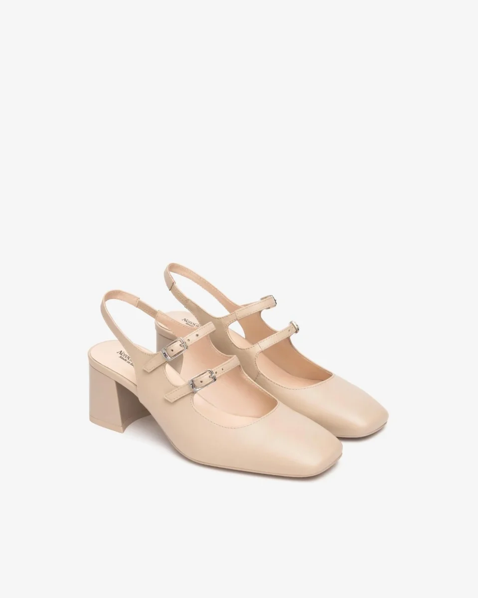 Chanel con tacco fasciato in tinta punta quadrata e doppio cinturino sul collo piede. Cinturino al tallone con elastico in tinta e fondo gomma flessibile e antiscivolo.