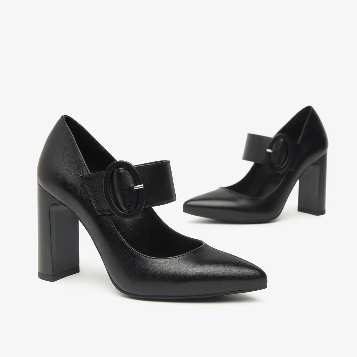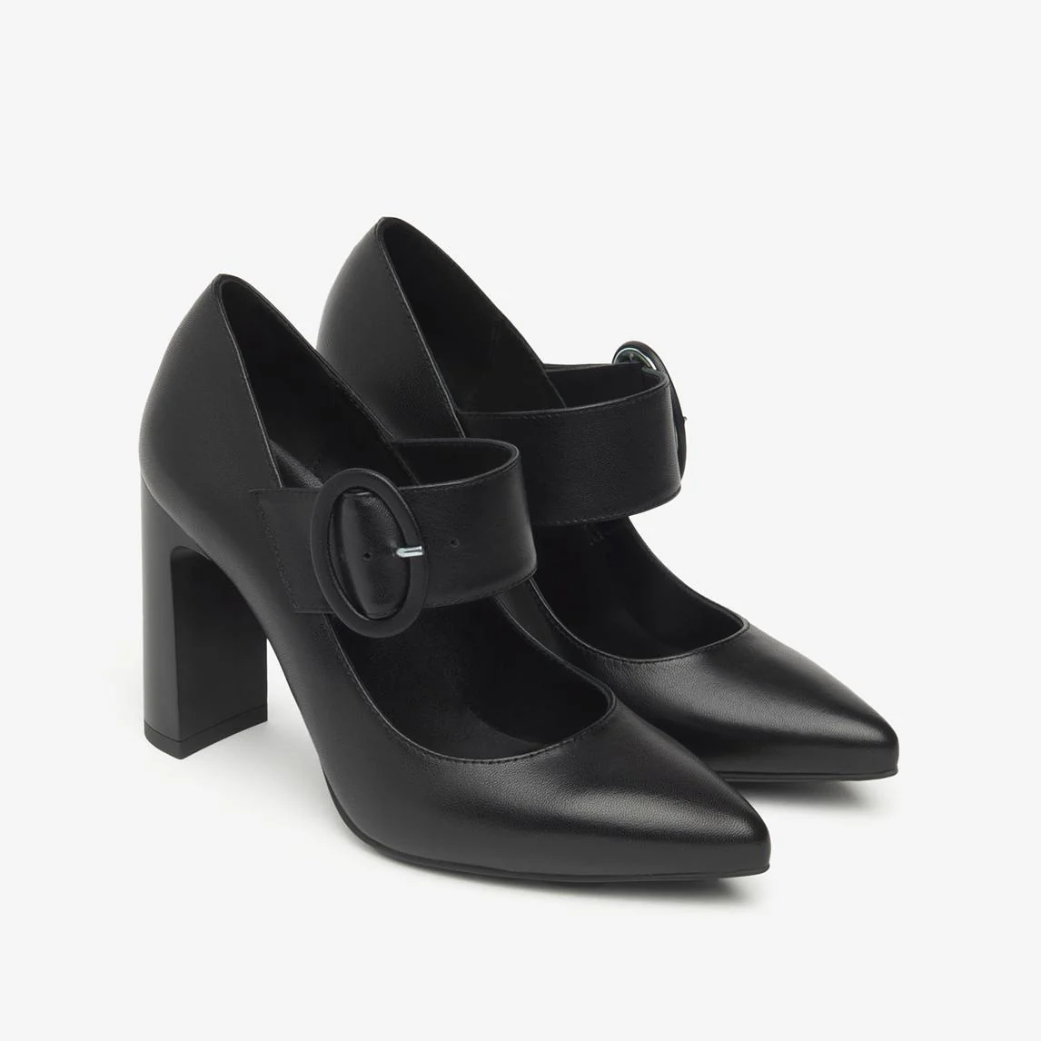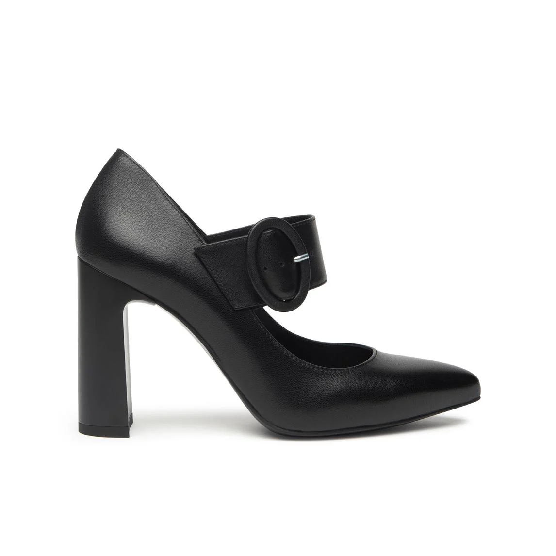 Decollete a punta con cinturino mary jane e tacco in tinta. Fondo gomma flessibile e antiscivolo.