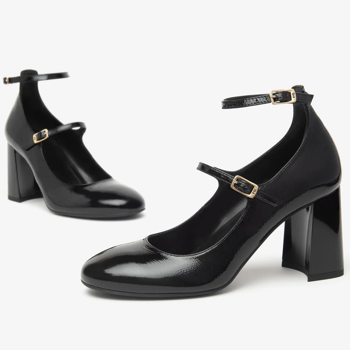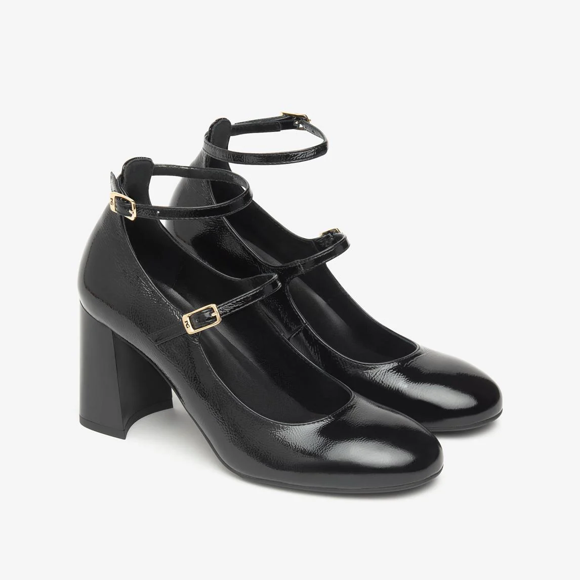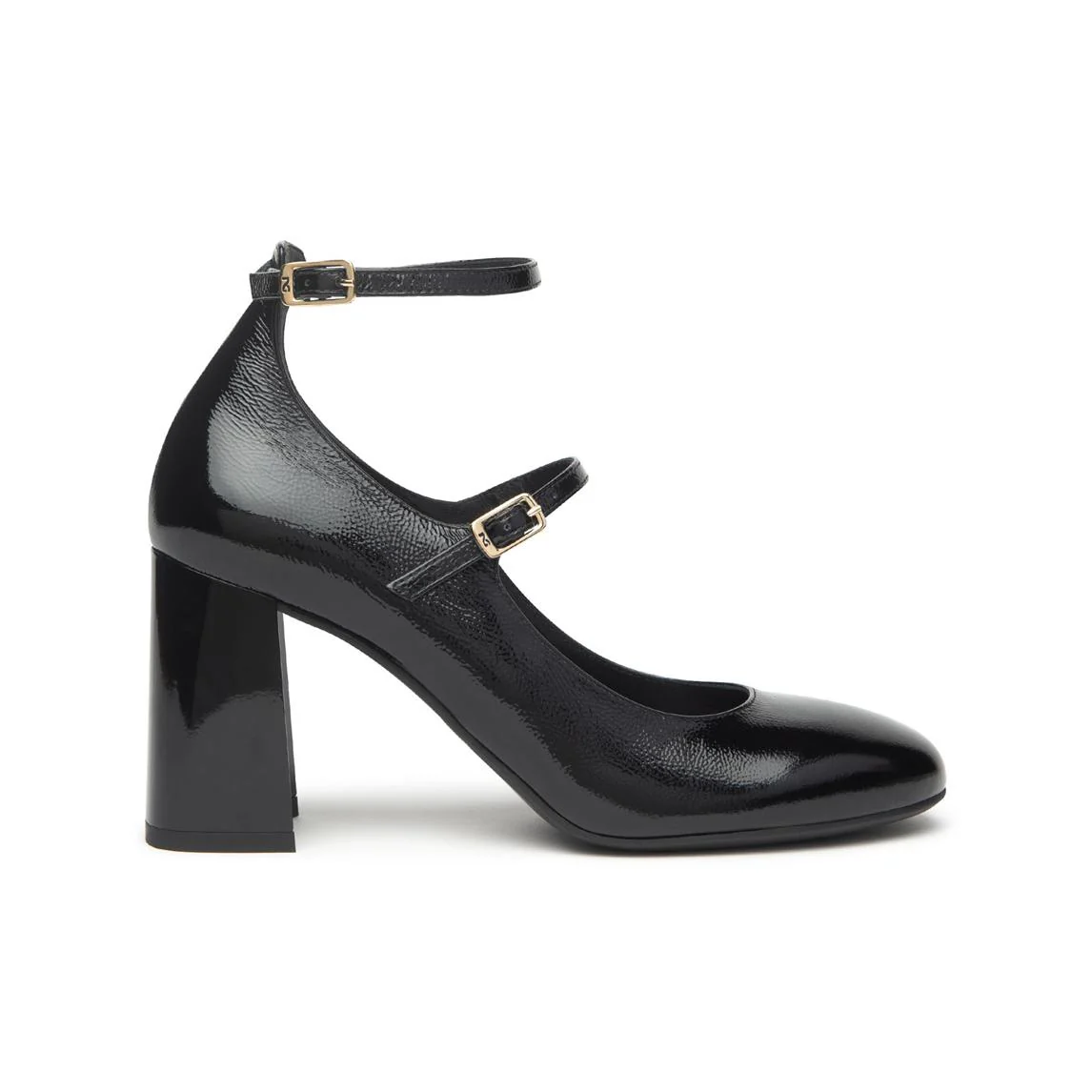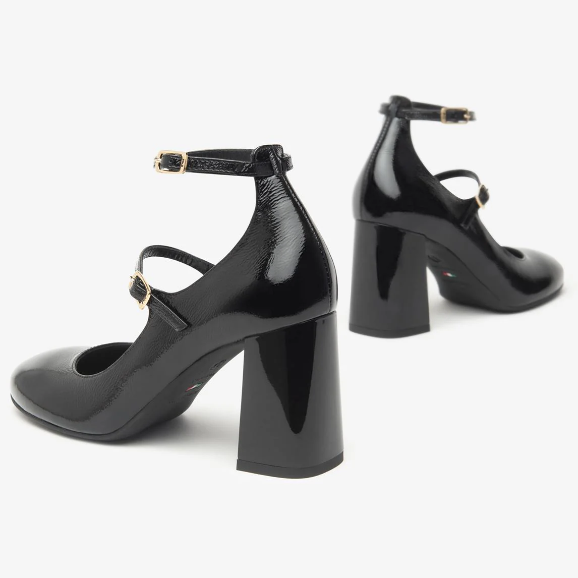 Decollete mary jane in vernice con doppio cinturino. Tacco fasciato in tinta. Fondo gomma flessibile e antiscivolo.