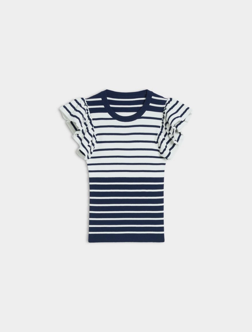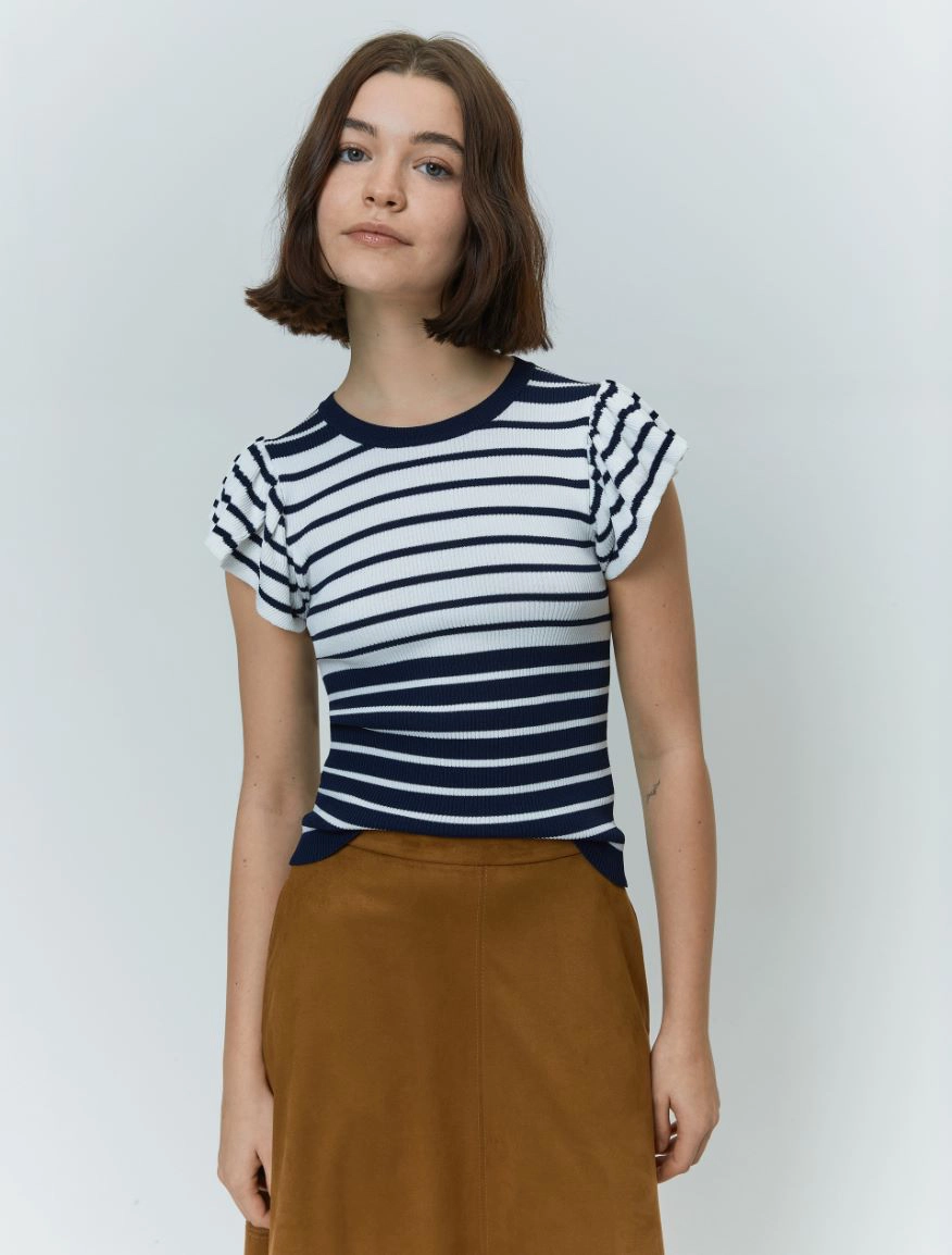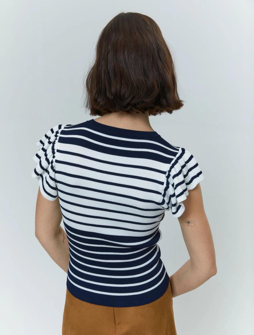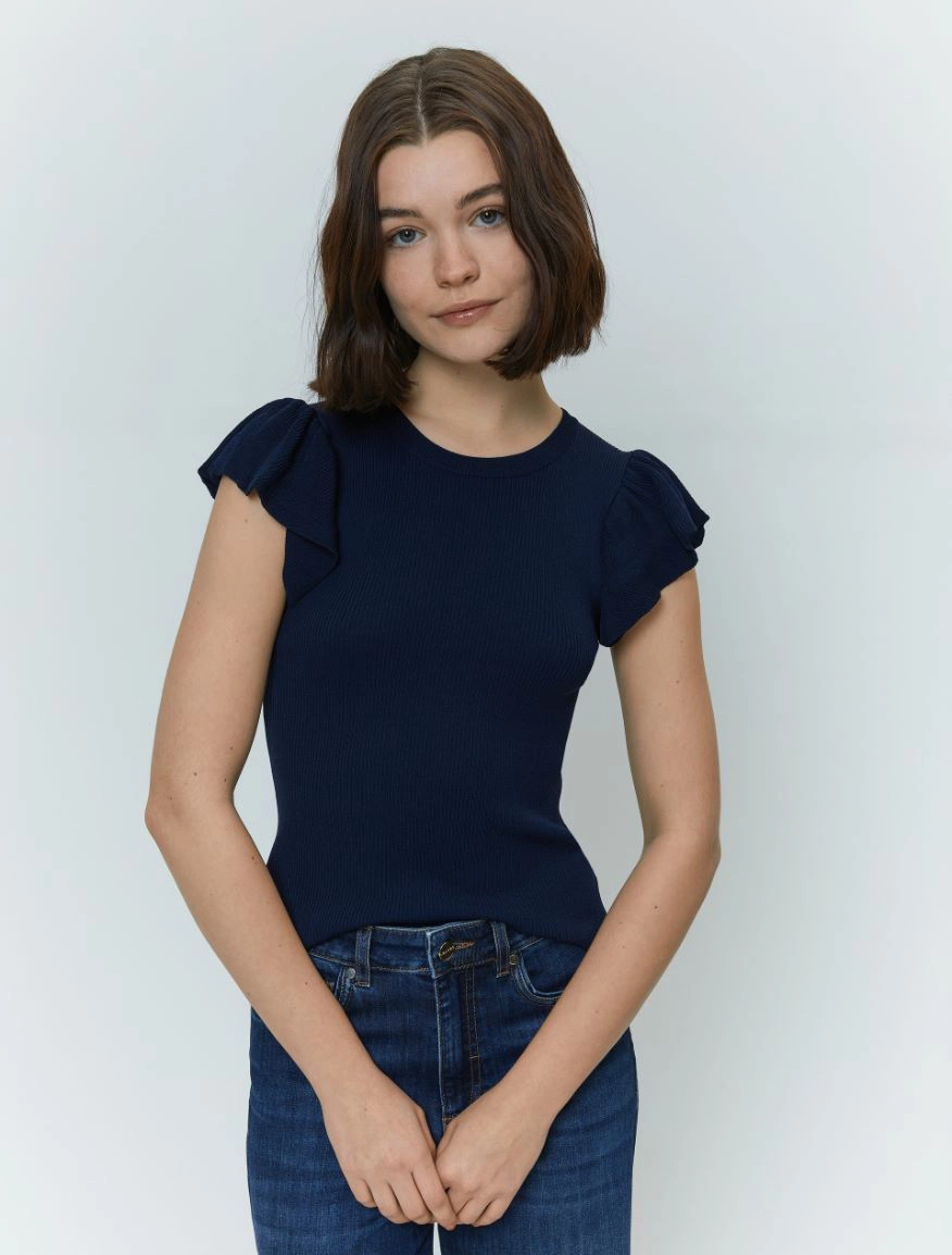 Delicata e femminile, per rendere personale anche il look piรน easy. Il capo fa parte del progetto “Match pointโ. Maglia in crรชpe a costine Linea semiaderente Scollo tondo Maniche corte a volant