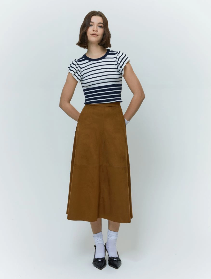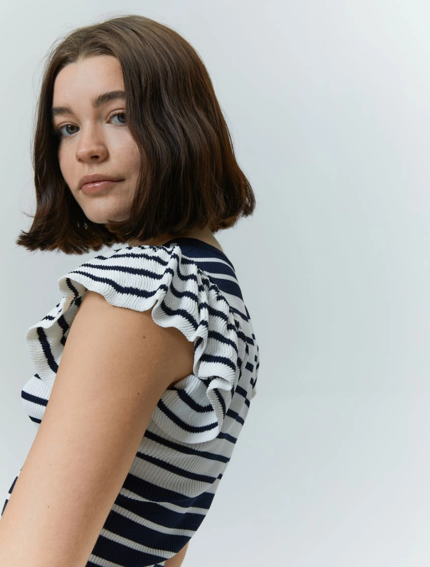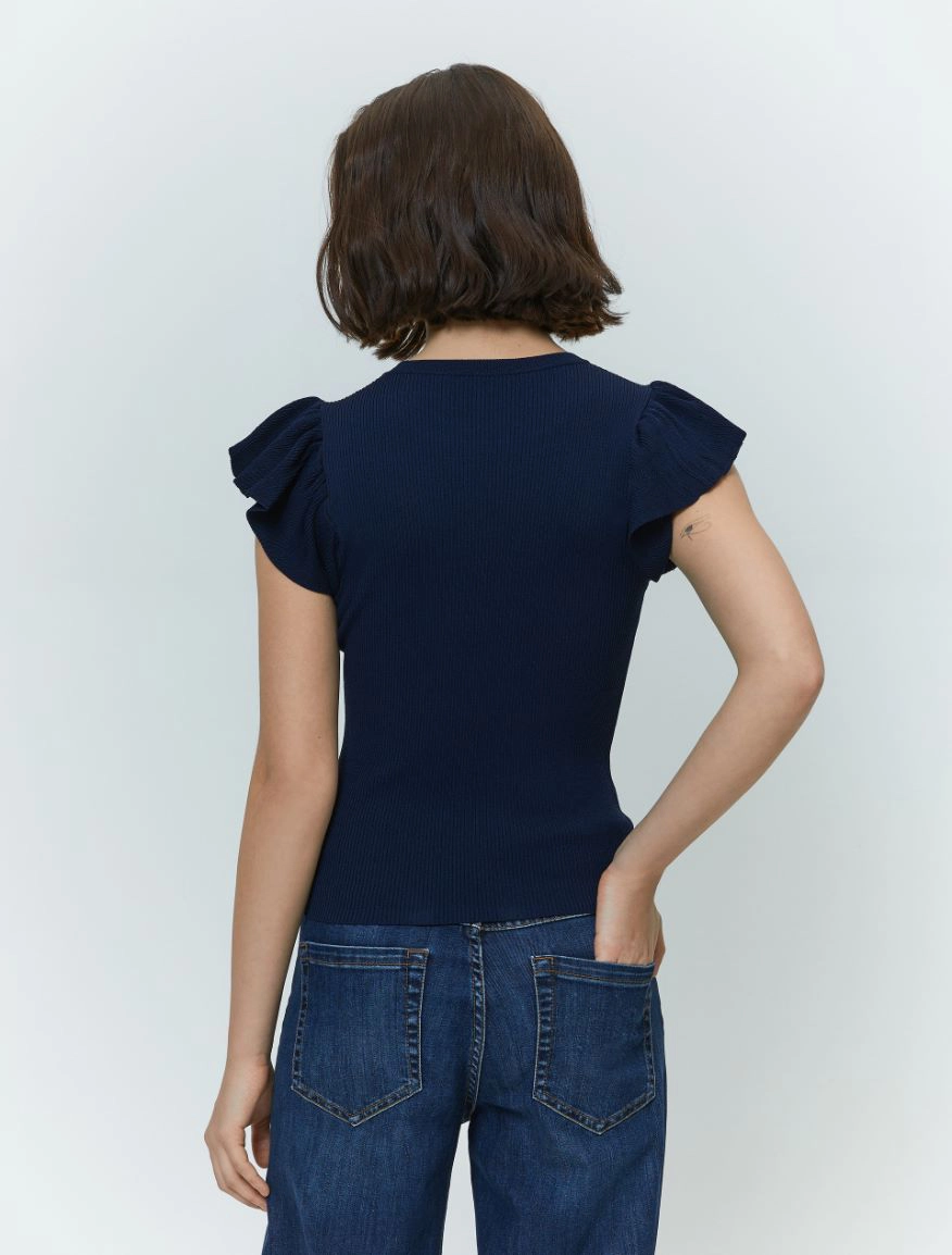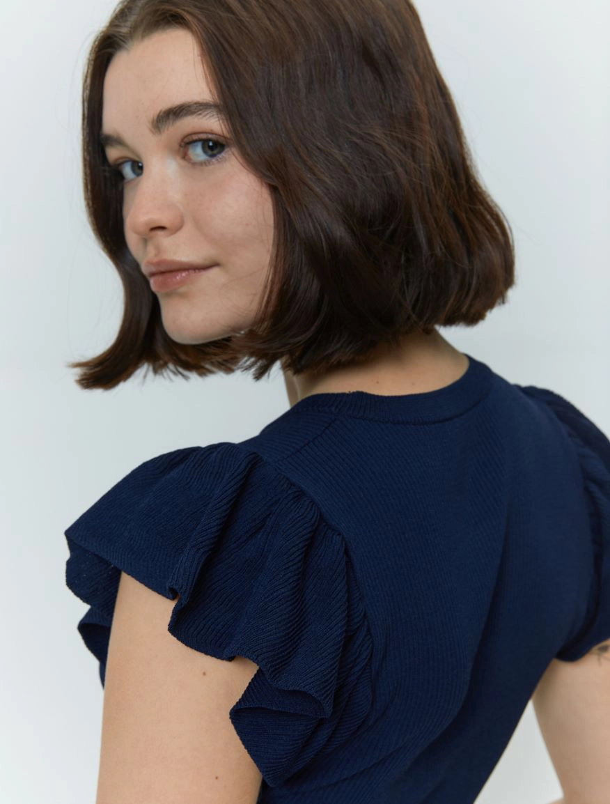 Delicata e femminile, per rendere personale anche il look piรน easy. Il capo fa parte del progetto “Match pointโ. Maglia in crรชpe a costine Linea semiaderente Scollo tondo Maniche corte a volant