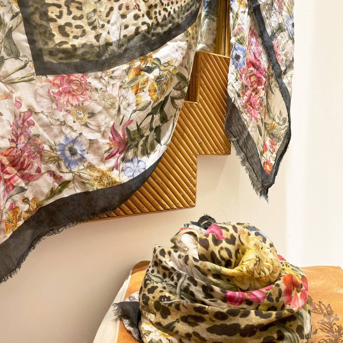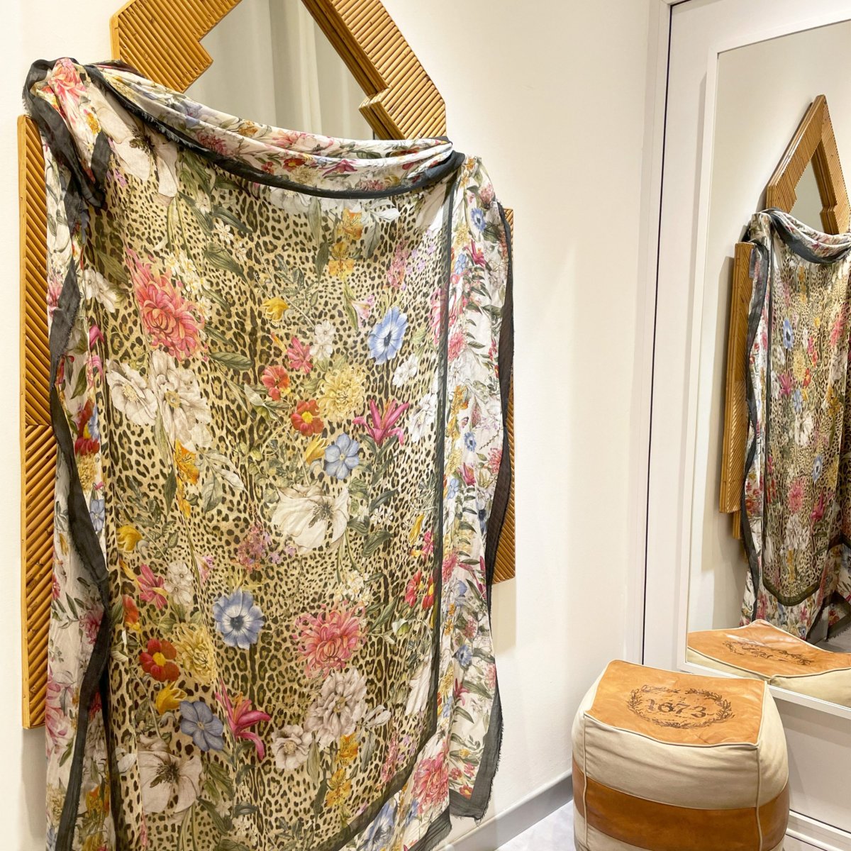 Sciarpa fantasia con fiori colorati su sfondo animalier e bordo sfrangiato a mano. Accessorio in modal e cashmere, Made in Italy, realizzato con materiali leggeri e pregiati, dove i colori e i disegni sono sempre originali creando una fusione tra moda ed arte.