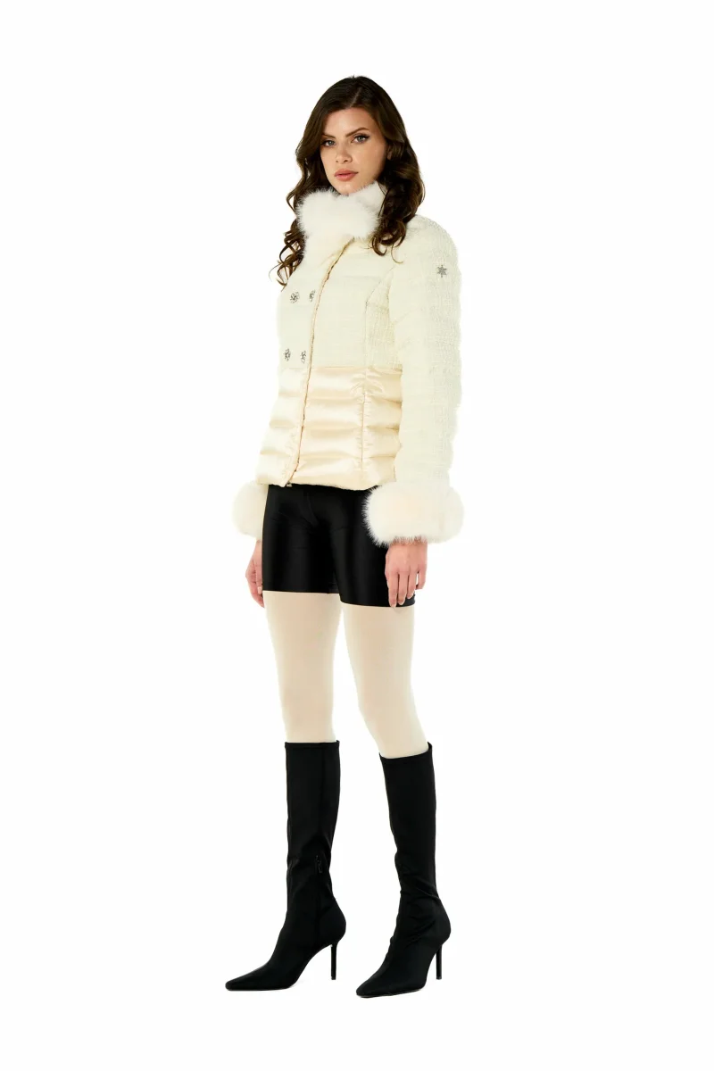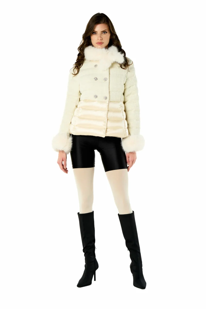 Bellissimo piumino doppiopetto corto bouclette No Secrets con bottoni gioiello, maniche e collo in ecopelliccia.
