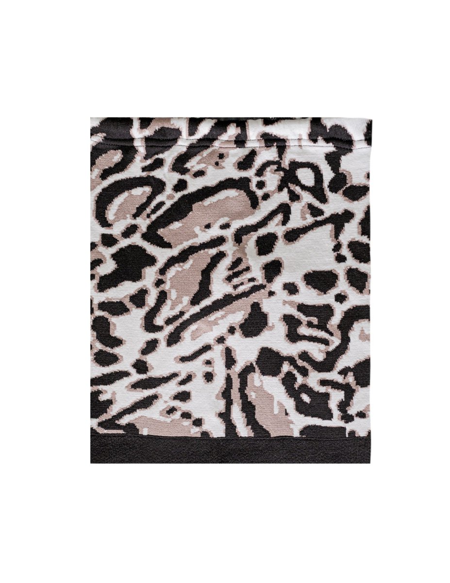 Scaldacollo con jacquard animalier realizzato nel tessuto tecnico DHtech 400; all’occorrenza puรฒ trasformarsi inoltre in un berretto.