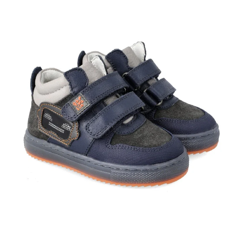 Sneakers alta da Maschietto realizzata in pelle Blu con inserti in pelle scamosciata grigia e puntale gommato rinforzato. Comfort e qualitร per grandi avventure! Si apre e si chiude facilmente con un doppio cinturino in velcro, plantare anatomico con trattamento antibatterico, fondo in gomma antiscivolo.