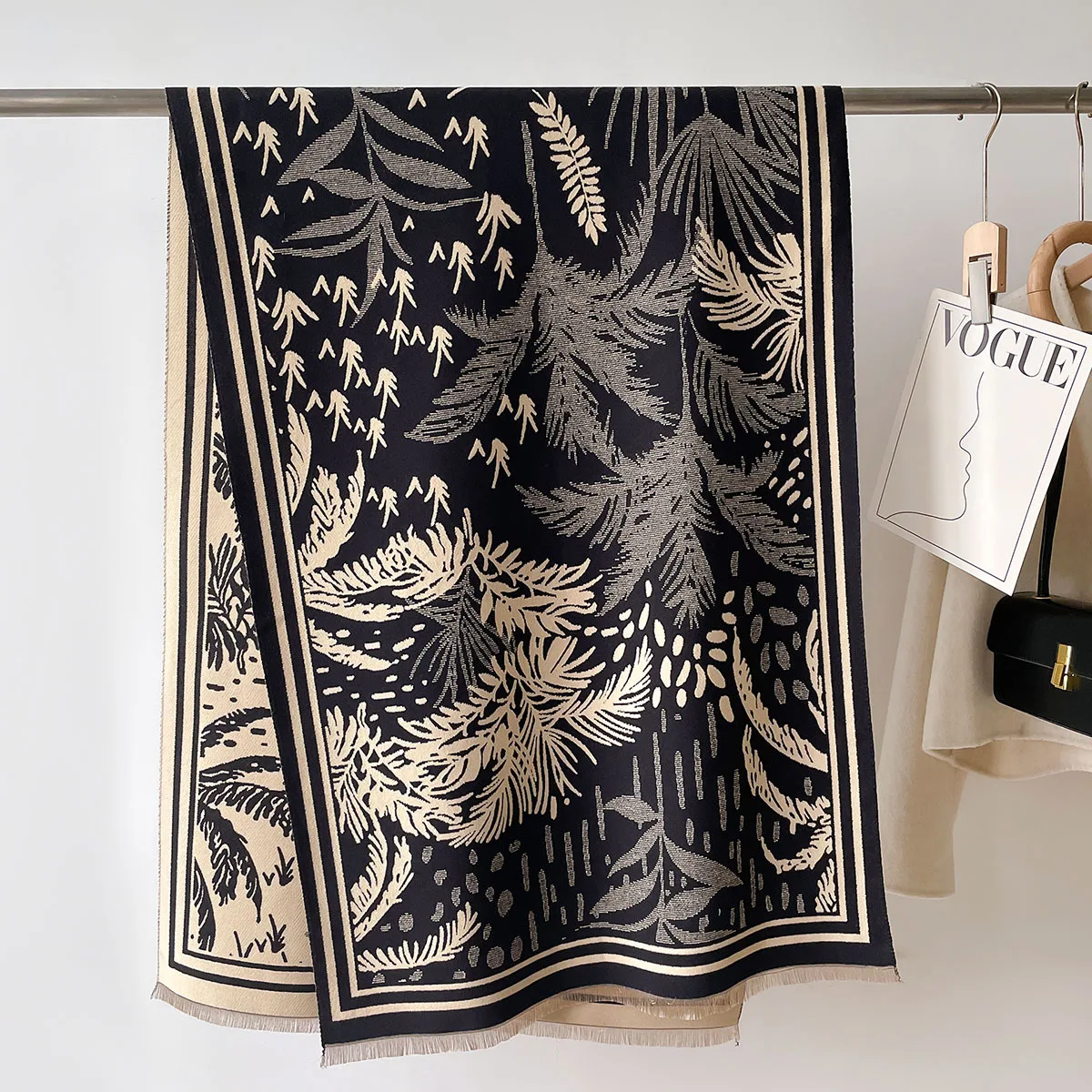 Aggiungete un tocco sofisticato al vostro stile con questa sciarpa a motivi geometrici neri e beige. Elegante e versatile, si abbina bene sia a un cappotto invernale che a un outfit piรน leggero per la mezza stagione.