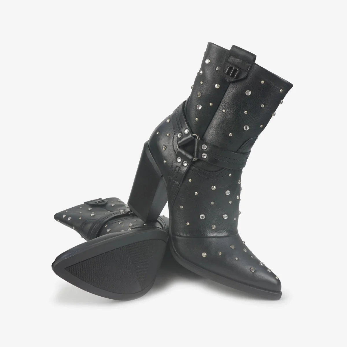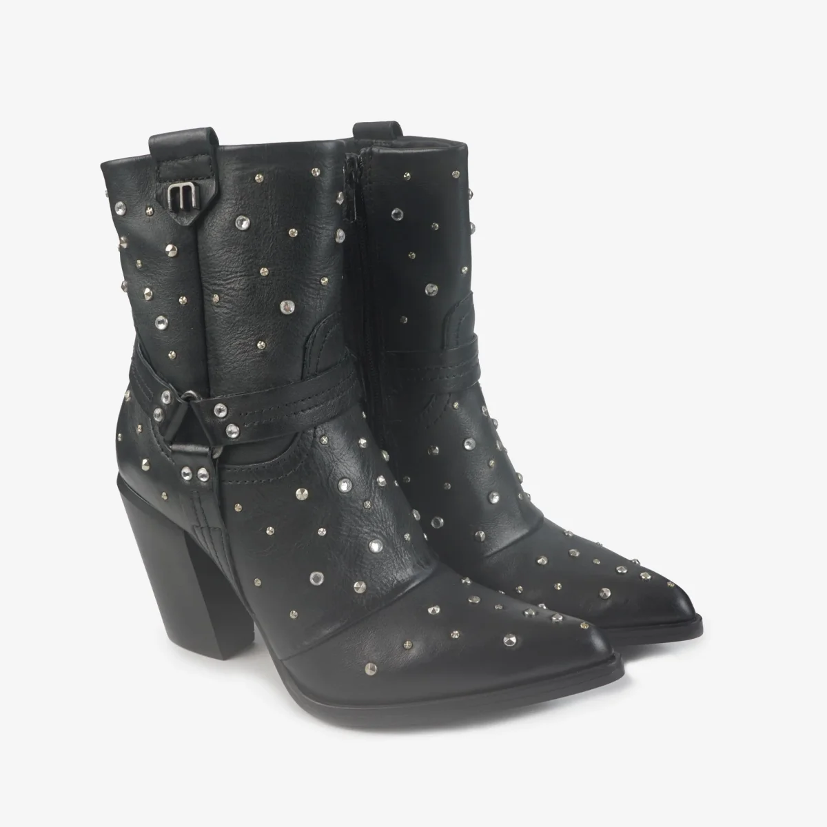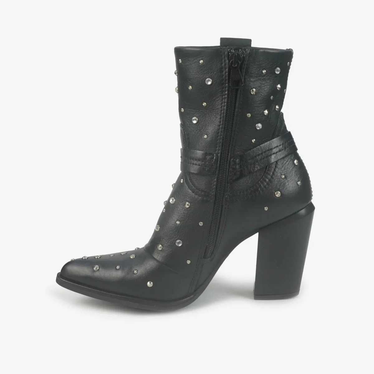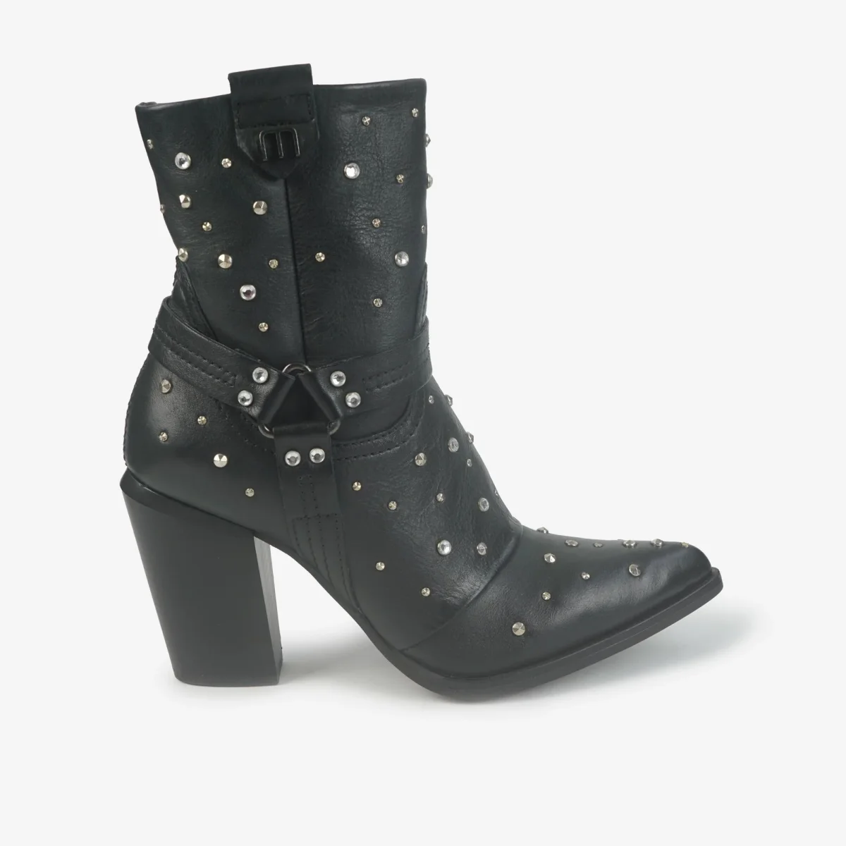 Stivaletto texano a punta in pelle con miscro strass e microborchie. Sperone in pelle alla caviglia.