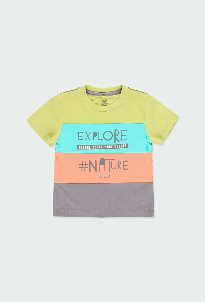 Maglietta a maglia liscia per bambino in cotone biologico color blu, verde, pompelmo e grigio scuro. Ha come decorazione una stampa di lettere color grigio scuro.